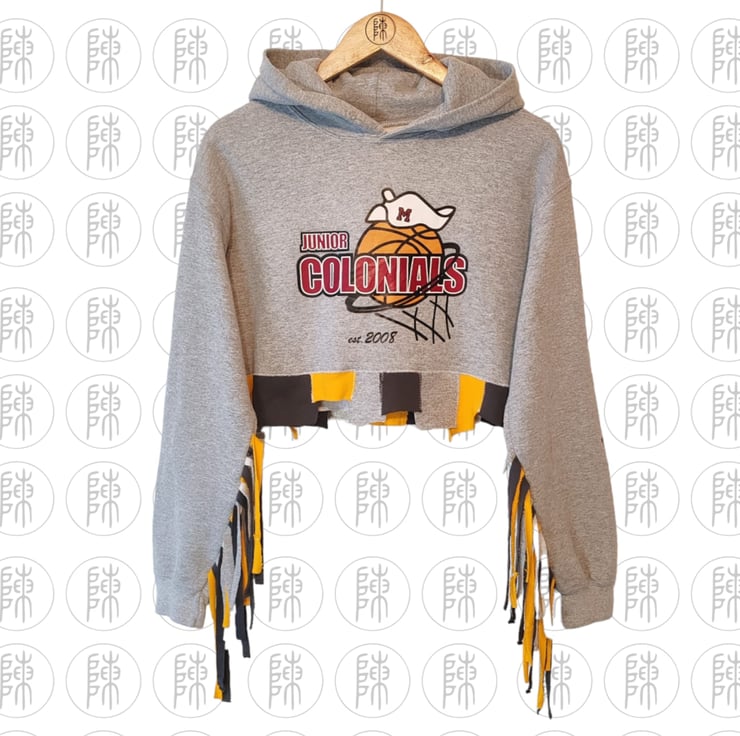 Grey upcycle rework Gildan cropped Hoodie. Large Junior Colonials graphic image on the front with Morristown text spell out on the sleeve. Patchwork scrappy grey and yellow hem with matching tassels on the sleeves. In good condition.