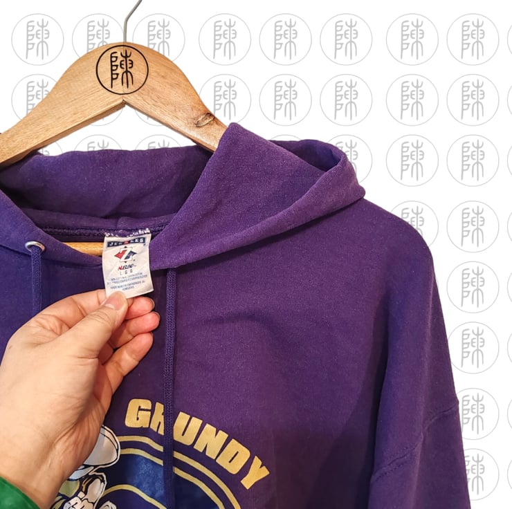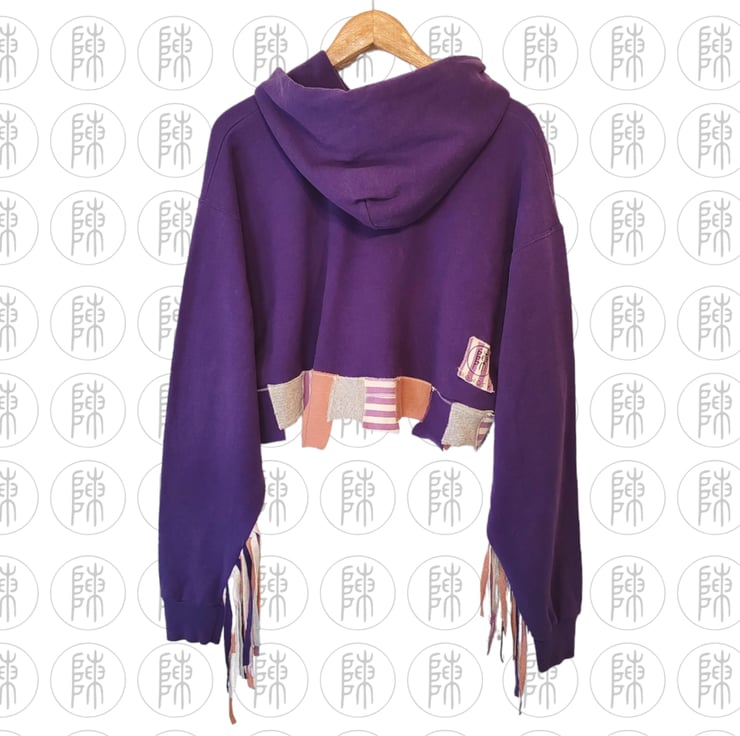 Purple Grundy Yellow Jacket rework upcycle varsity hoodie. Scrappy cropped hem with tassel sleeves. In good condition.