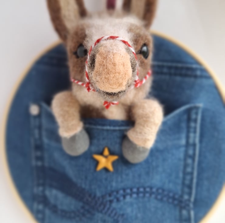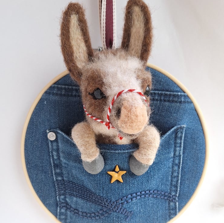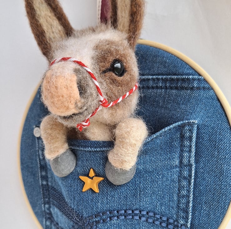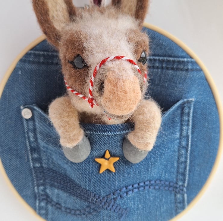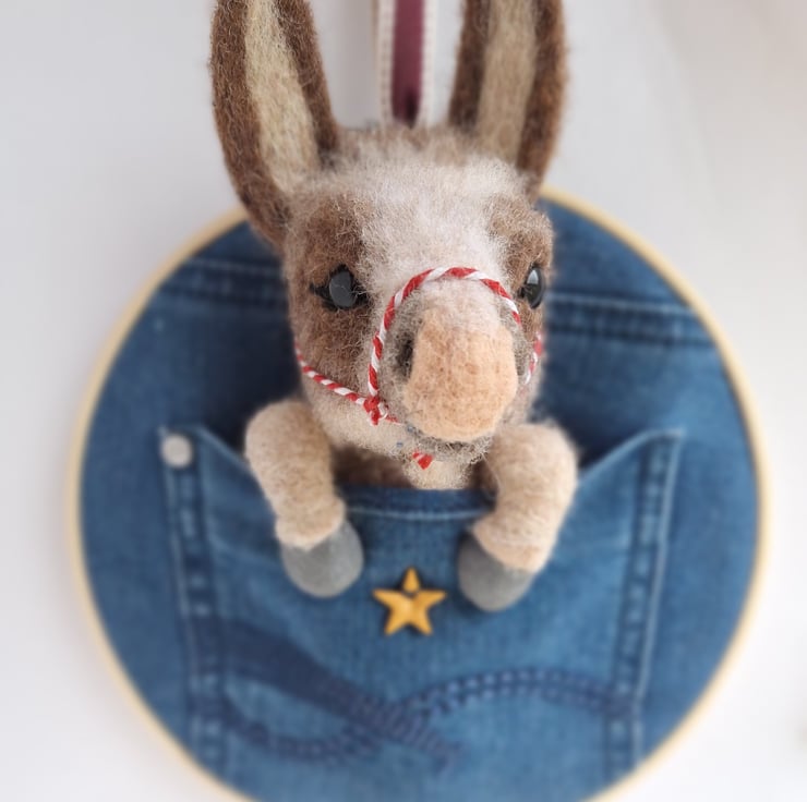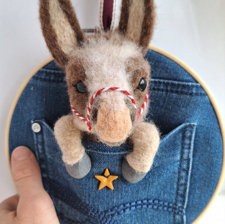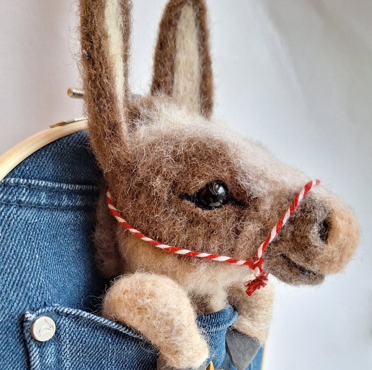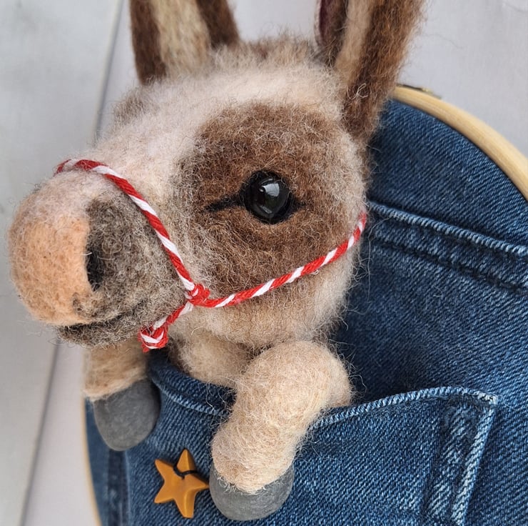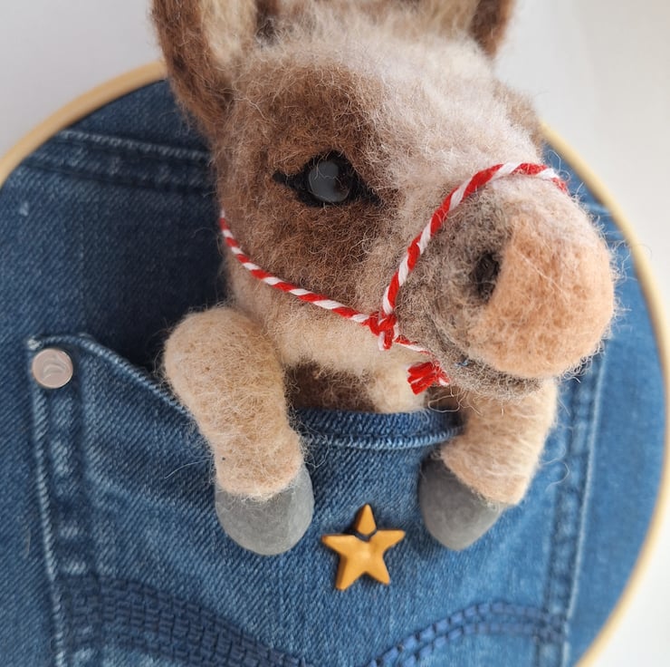She is snuggled in an upcycled denim pocket, and features glass eyes, polymer clay hooves and a tiny handmade halter.