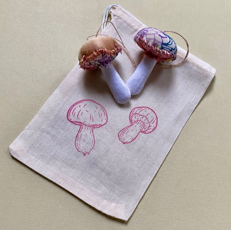These mini mushies are hand stitched from beautiful vintage silks and linens, recycled from remnants and vintage clothing. No two pairs are alike and though made from the same fabric, the pair you receive will not be identical to the picture. Each of these cute little pairs comes in a hand stamped linen bag perfect for gifting and storing (example shown in second photo). A great decoration for lovers of fairytale and fungi, something to hang at Christmas tree or all year long!
