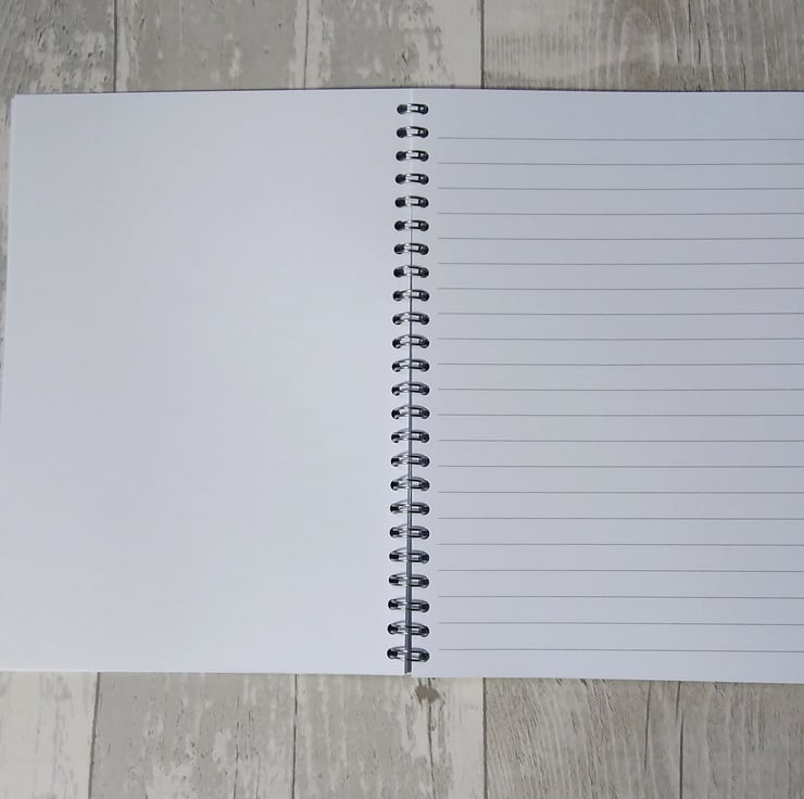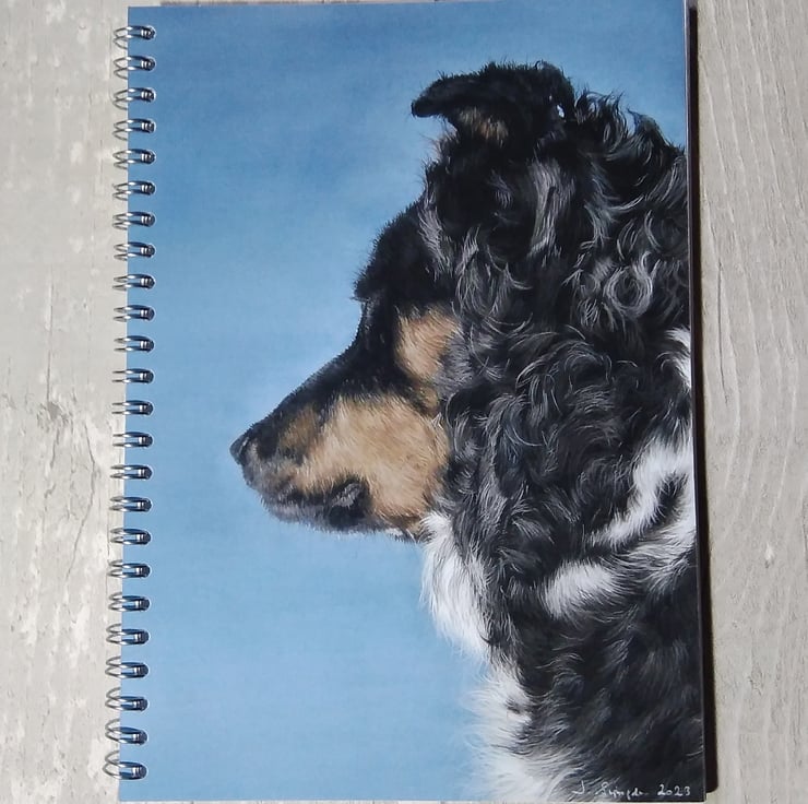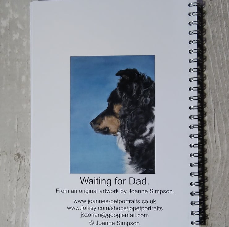My portrait of Pip 'Waiting for Dad' is now available as a spiral bound notebook. There are 30 pages which are lined on one side and blank on the other. A perfect gift for anyone who likes to keep a journal, a doodle book, scrap book, recipe book etc. The picture could be framed when you've finished using it as a notebook. Size A5 (8.27x5.83 inches) A unique gift or stocking filler. I'm really pleased with the quality of this notebook.