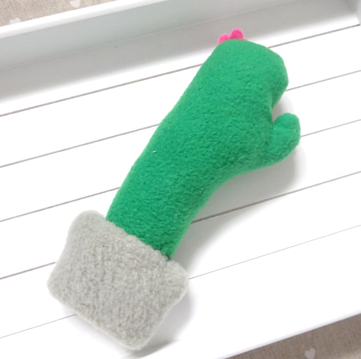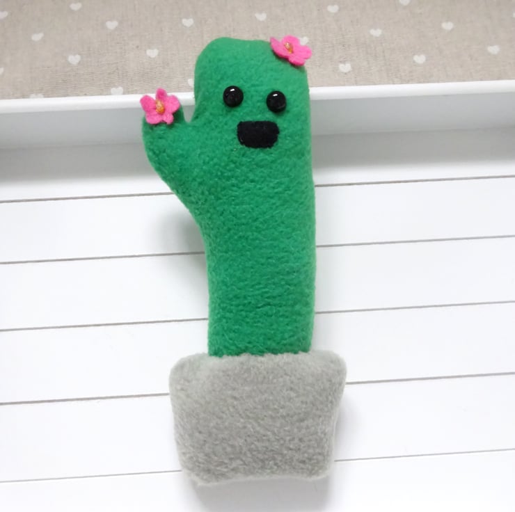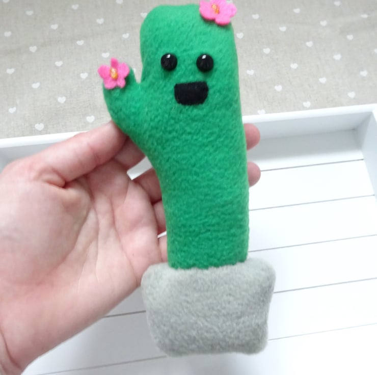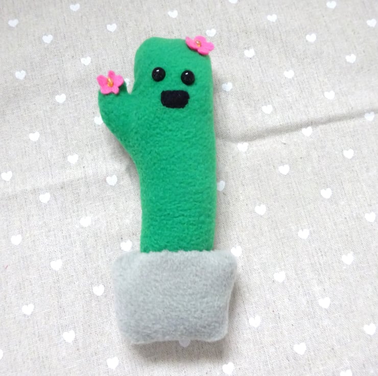 It has two pink flowers with a small glass bead sewn into the middle. It also features black safety eyes and a black felt smiley mouth.