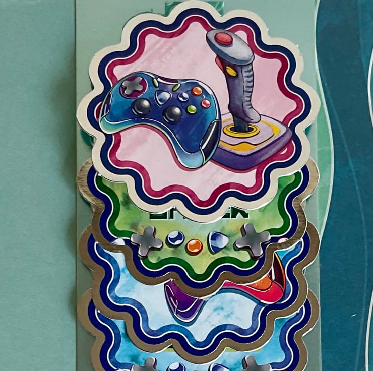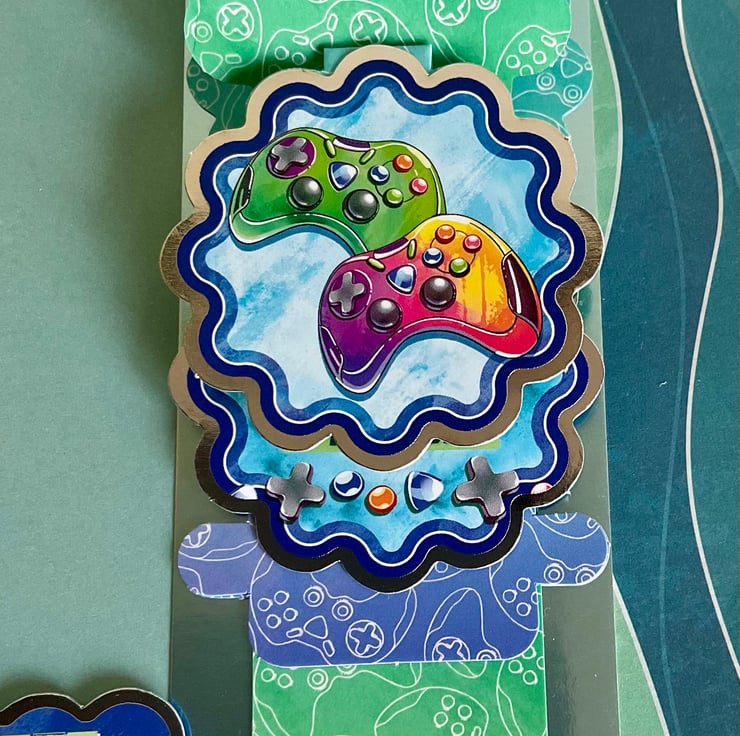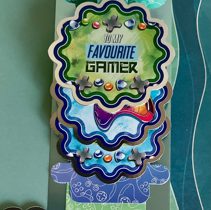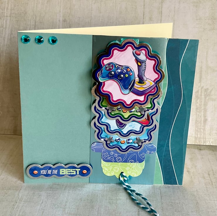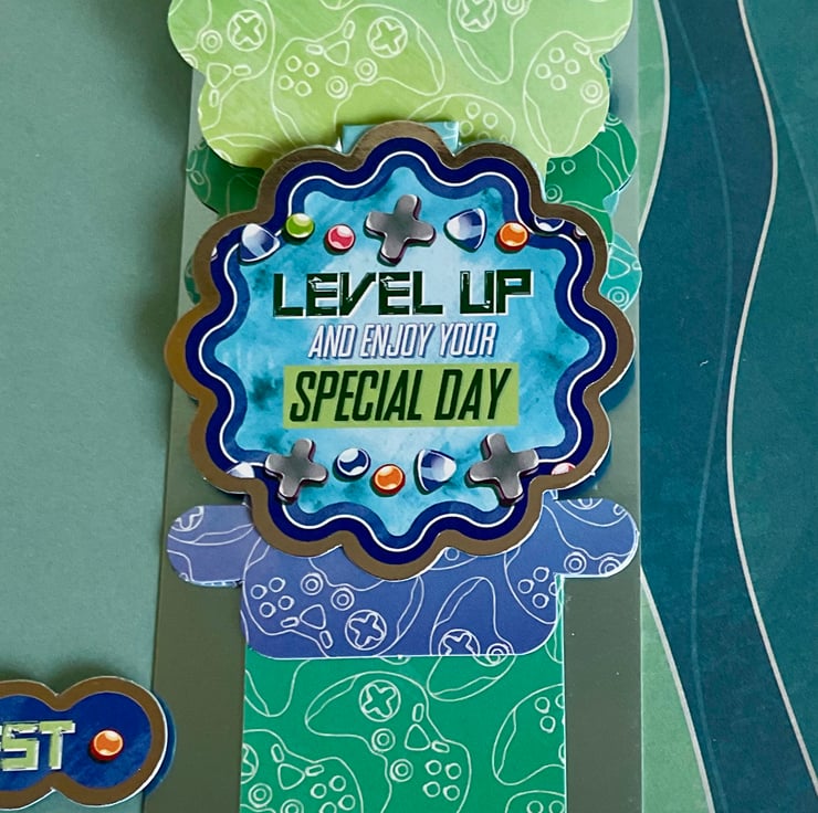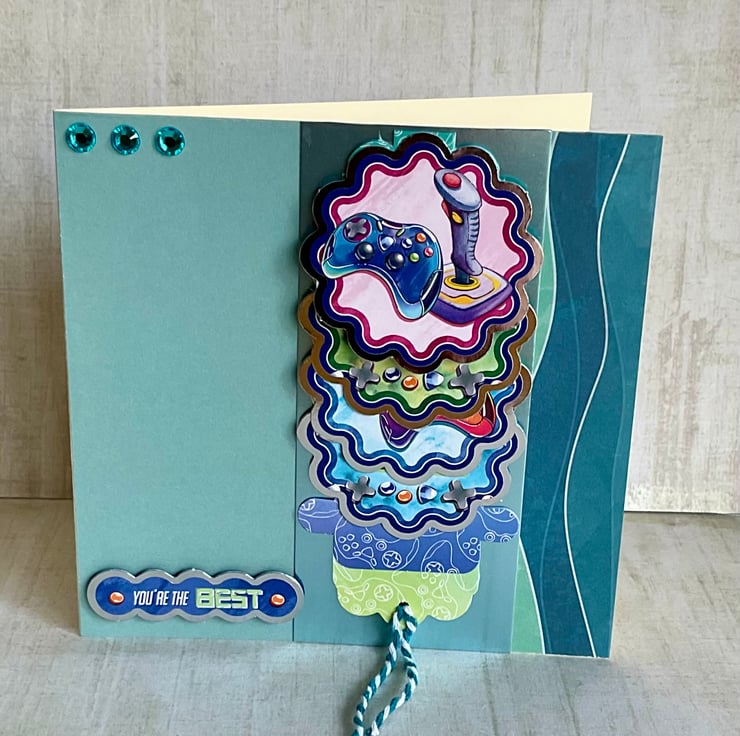 This waterfall card features game controllers on four separate scenes which are revealed when you pull the string. Each little picture has a gaming theme with controllers and a joy stick and the wording To my favourite gamer and Level up and enjoy your special day with a silver surround.