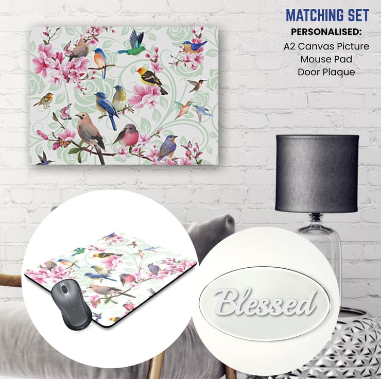 Butterfly Flowers artistic inspired matching bundle set featuring personalised A2 canvas picture, mouse pad and door plaque set. These items are professionally handmade and printed using the latest technology in inkjet pigment printing & engraving techniques to achieve a vivid finishing look. This beautiful bundle set is ideal for your home décor, office space, a gift or keepsake.