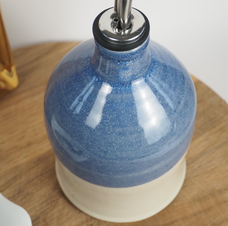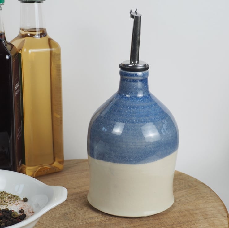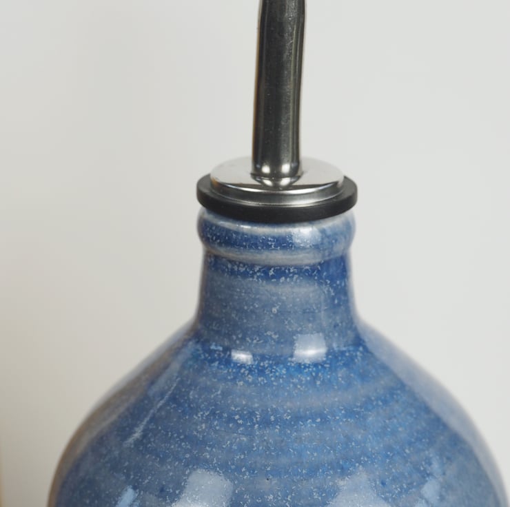 A glossy blue and white ceramic bottle with a push fit stainless steel pourer. Can be filled with oil, vinegar - in fact any liquid of your choice that you want to pour easily. Remove the pourer and it can also be a vase. Inside there is a glossy transparent glaze to ensure it can be cleaned easily. Thrown on the wheel using stoneware clay, and fired to high temperature. 14cm tall plus 6cm pourer
