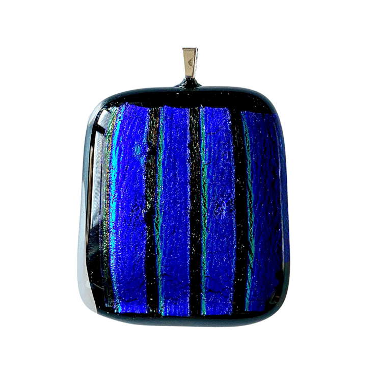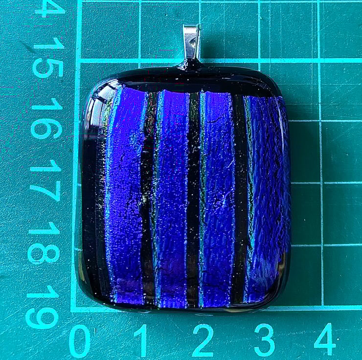 This glass pendant was made by fusing strips of shimmering blue dichroic glass on a black base and capped with a clear layer of glass. It was fired at 800 degrees Celsius in a specialist glass kiln and gently cooled over a 12 hour period. It measures approximately 3.4cm by 3.9 cm.
