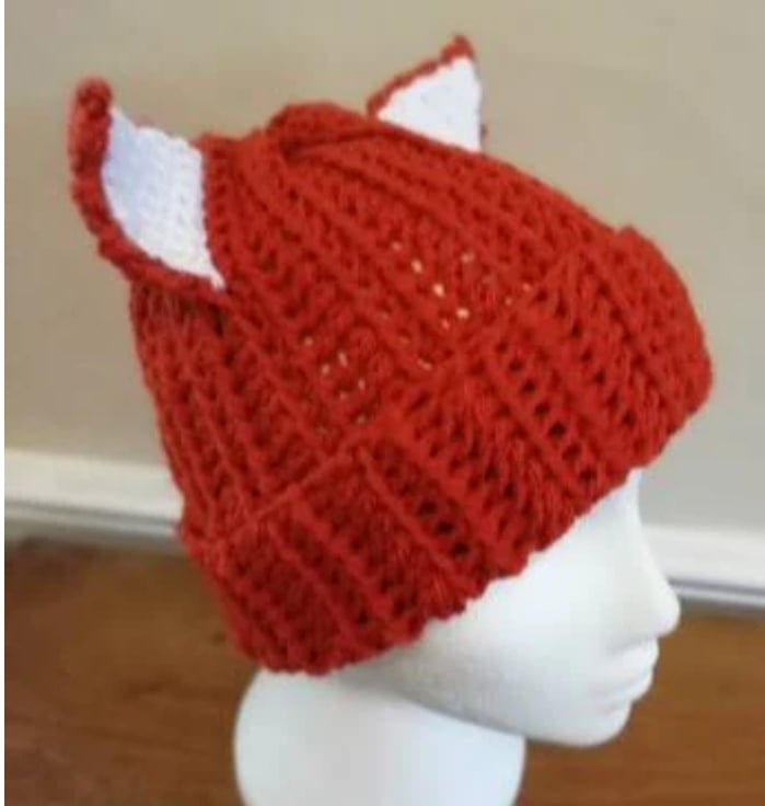 Crochet beanie hat in chunky pumpkin yarn with stand up fox ears.