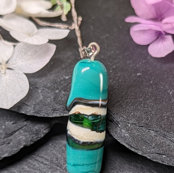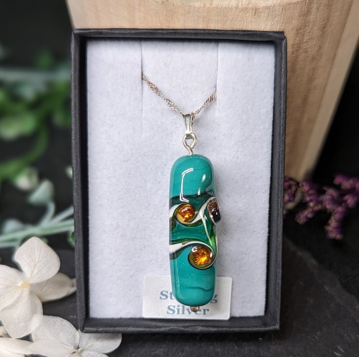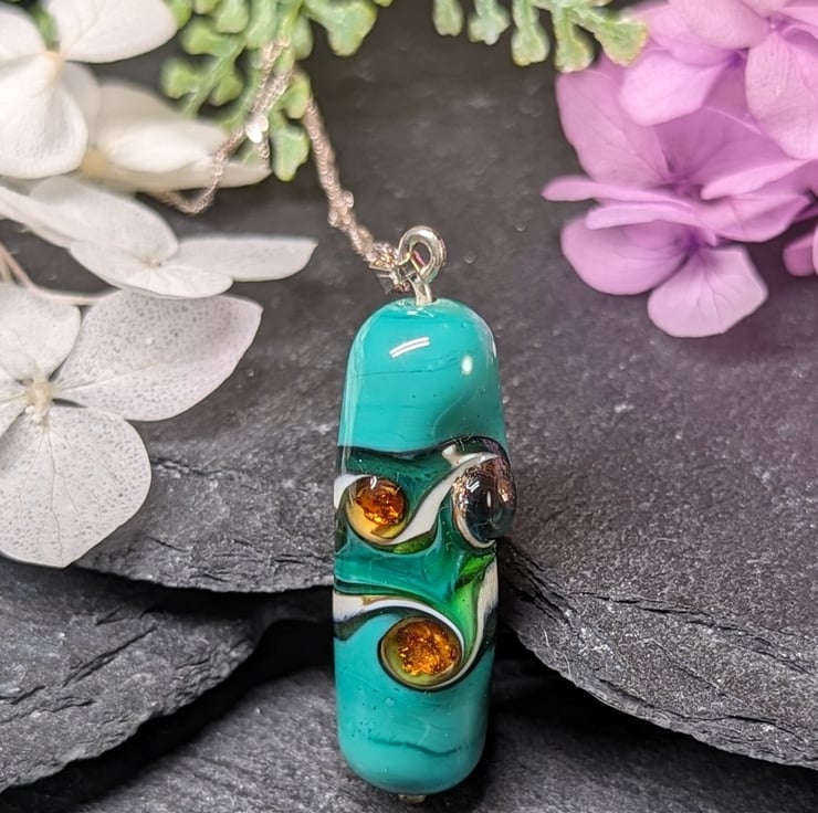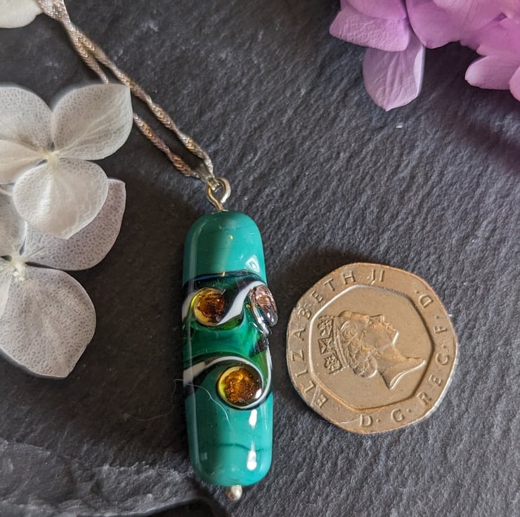 A bespoke lampwork pendant that is rich in green hues and a swirling pattern. A silvered stringer and green twistie create a rippling pattern across the bead and an amber coloured stringer coated with fine silver adds a gemstone effect. The lampwork bead starts life as simple glass rods that I melt in the flame and onto mandrels. I then add layers of glass and continue to melt and shape in the flame.