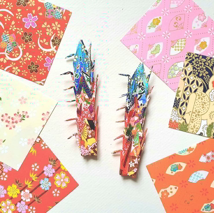 The colours will be from random beautiful chiyogami patterns, unless you want to specify a preference such as: cool colours, warm colours, pinks, reds, blues, greens, neutrals. These can be made to order.