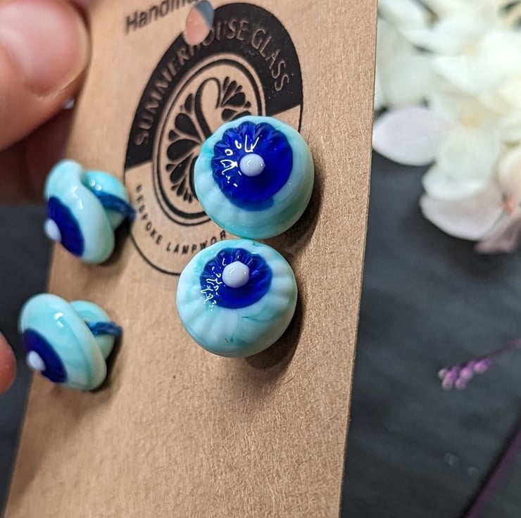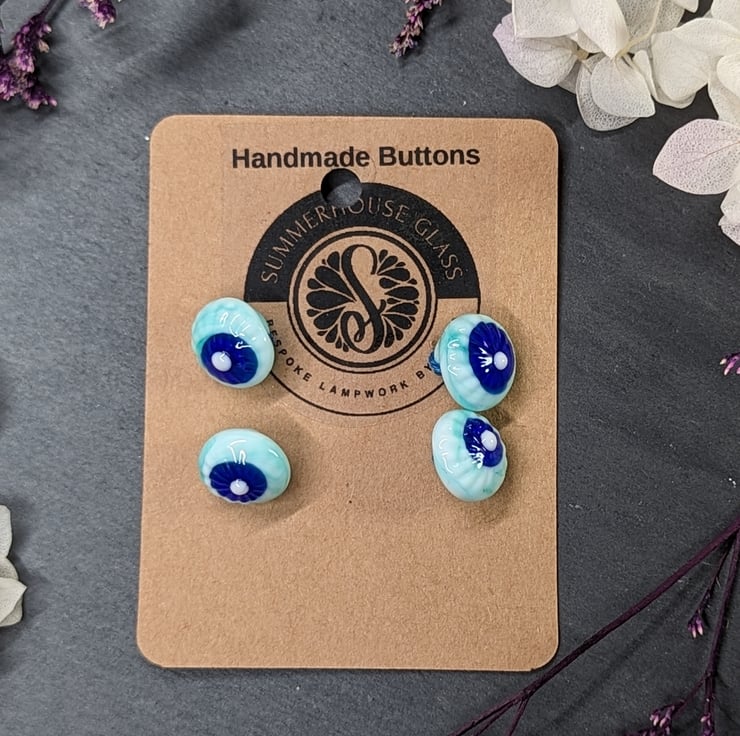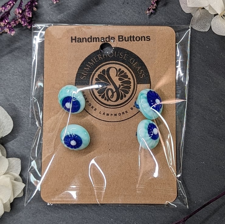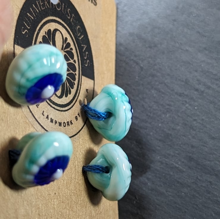 The glass buttons are shank style and have a small ridge on the back of the button that helps guide the needle through (photo 8). They are roughly 14mm in size but they may vary slightly in style and shape as each is individually made.