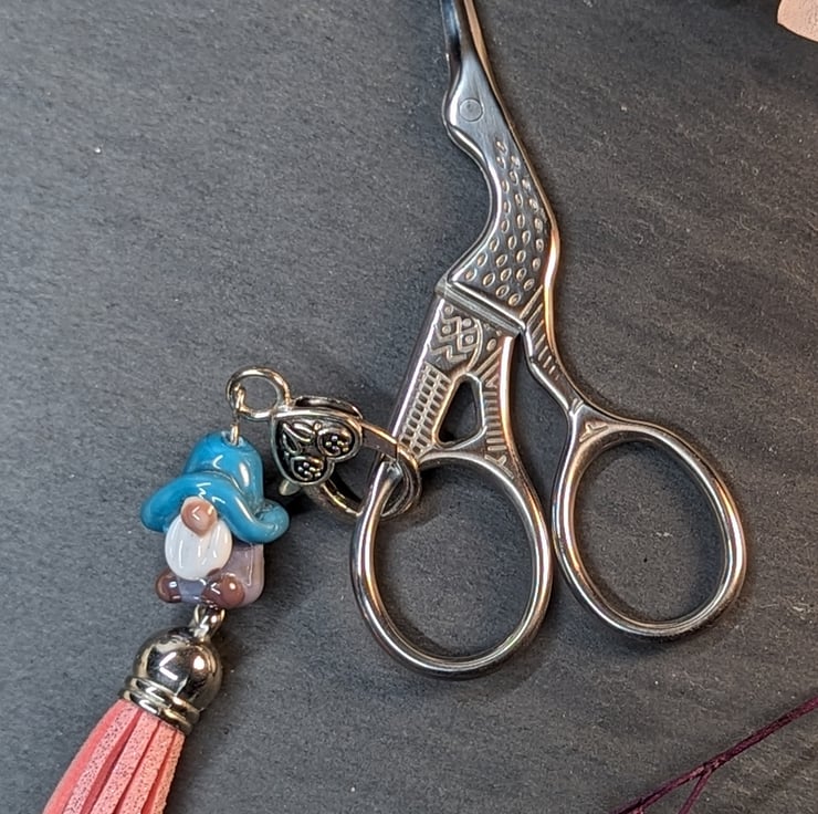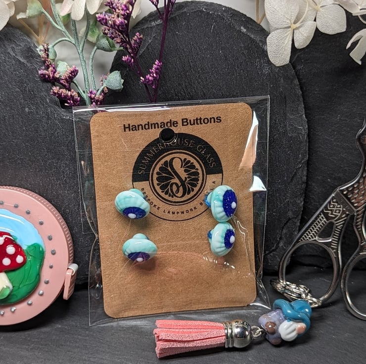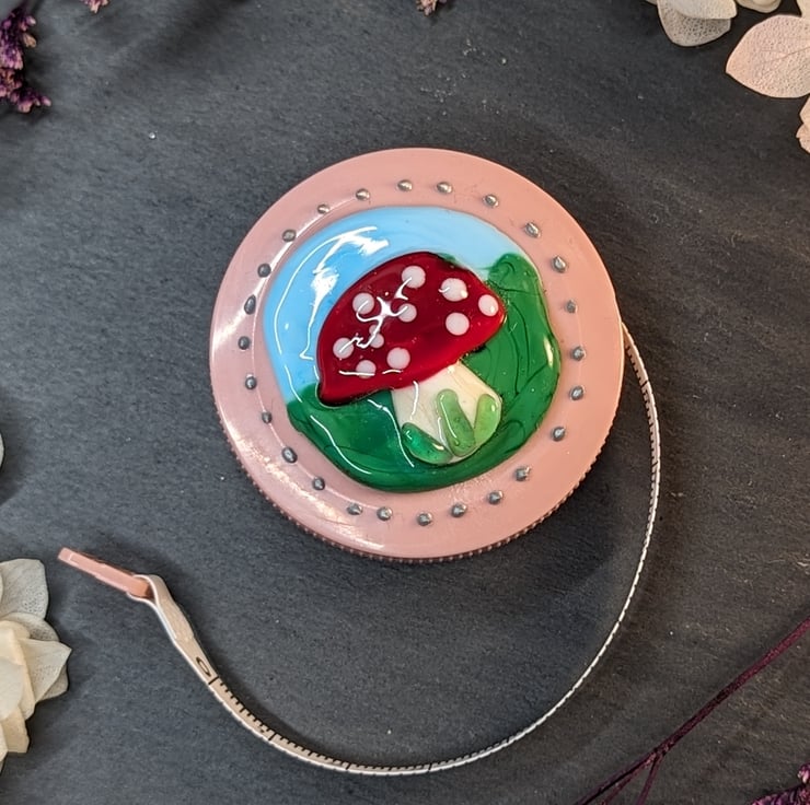 A bespoke lampwork adorned sewing kit with handmade glass buttons, retractable measuring tape with a cabochon glass mushroom and embroidery style scissors with a gonk glass bead charm. Traditional lampwork (also known as flamework) techniques have been used to create the glass items.
