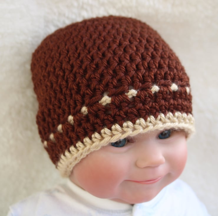 A sweet and simple pull on beanie hat perfect for keeping a baby's head covered and warm when out and about during the cooler weather.