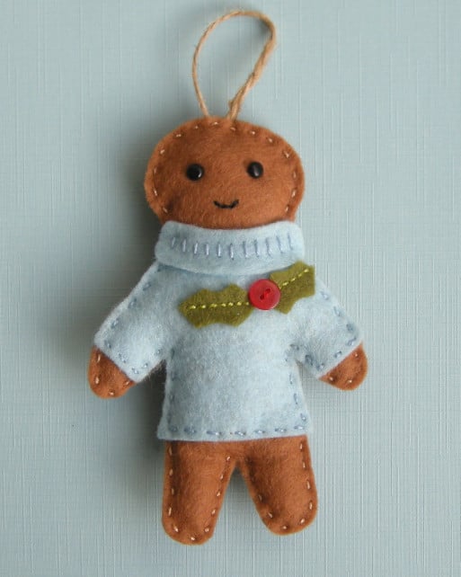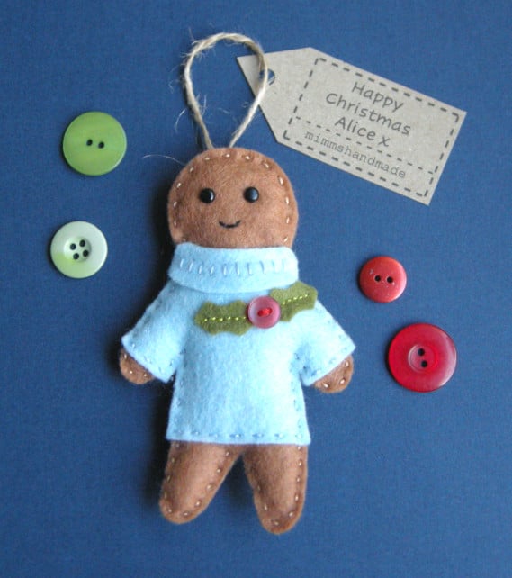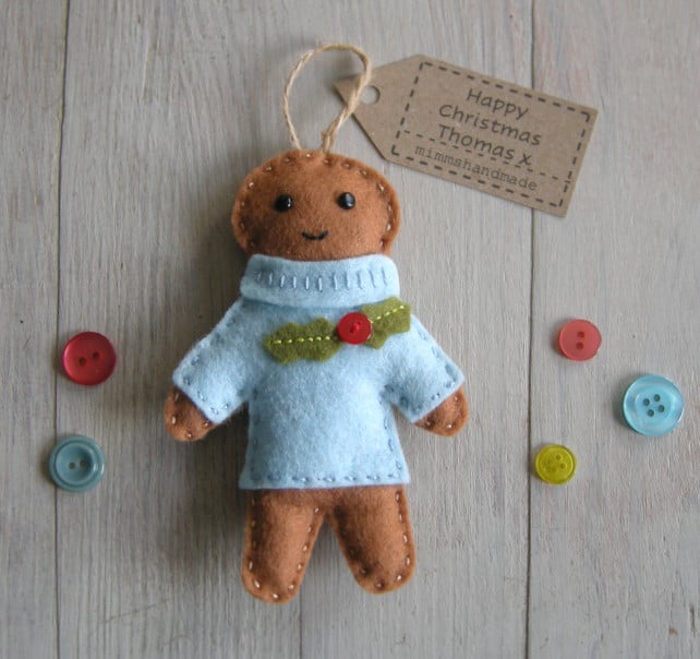 The gingerbread decoration is designed and then hand cut from good quality felt then the details of the face and jumper are hand sewn finished off with a vintage button and then the decoration is sewn together making each decoration unique.