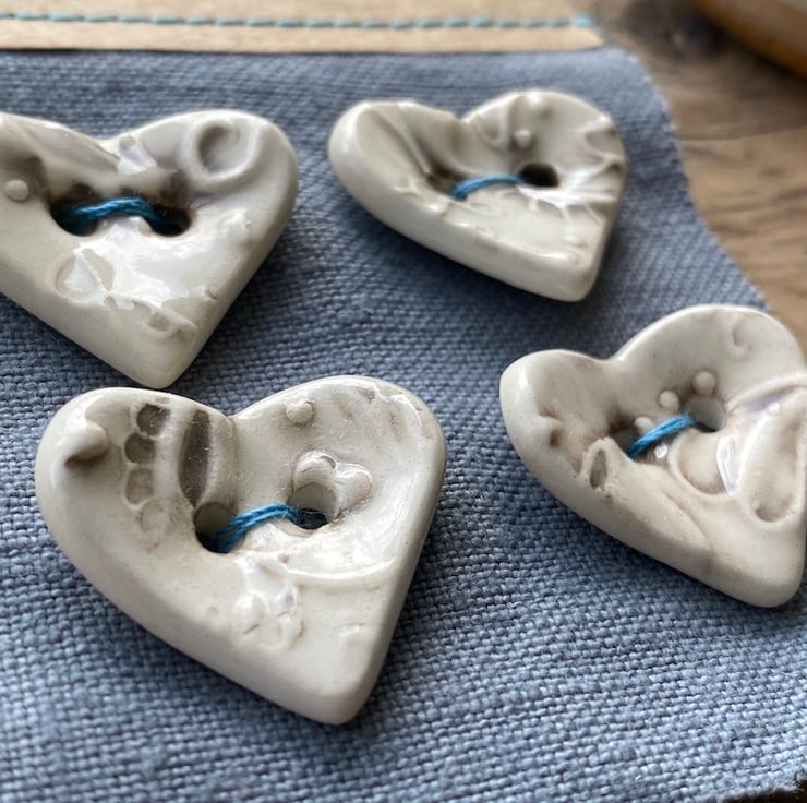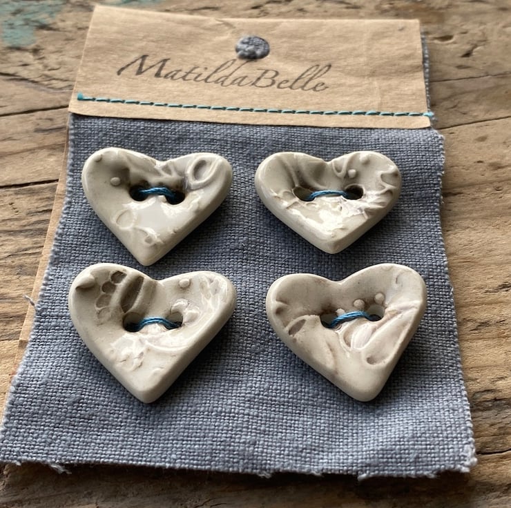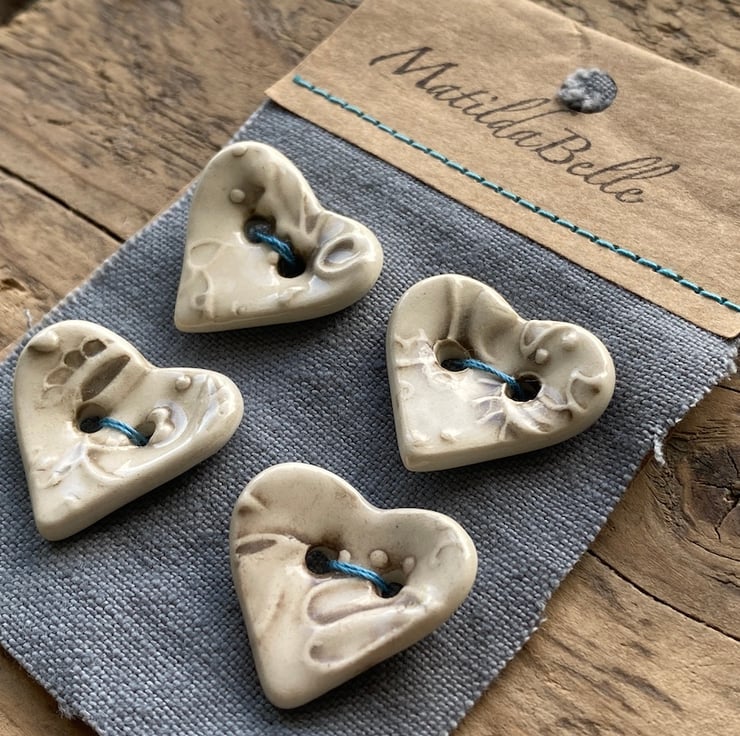 Set of four Handmade Heart Buttons. Crafted from the finest Earthenware Clay, each button is a unique piece of artistry. Imprinted with an original MatildaBelle Paisley Carving and highlighted with a subtle aged effect glaze.