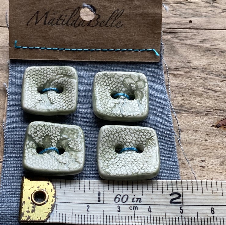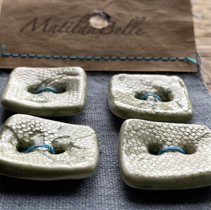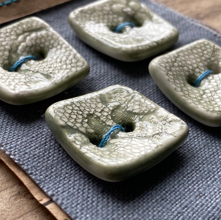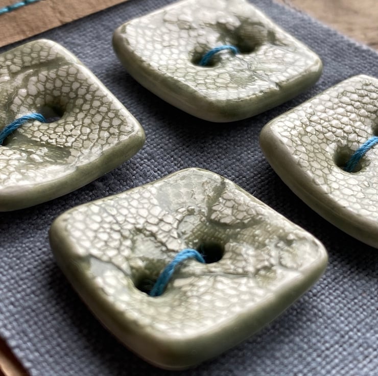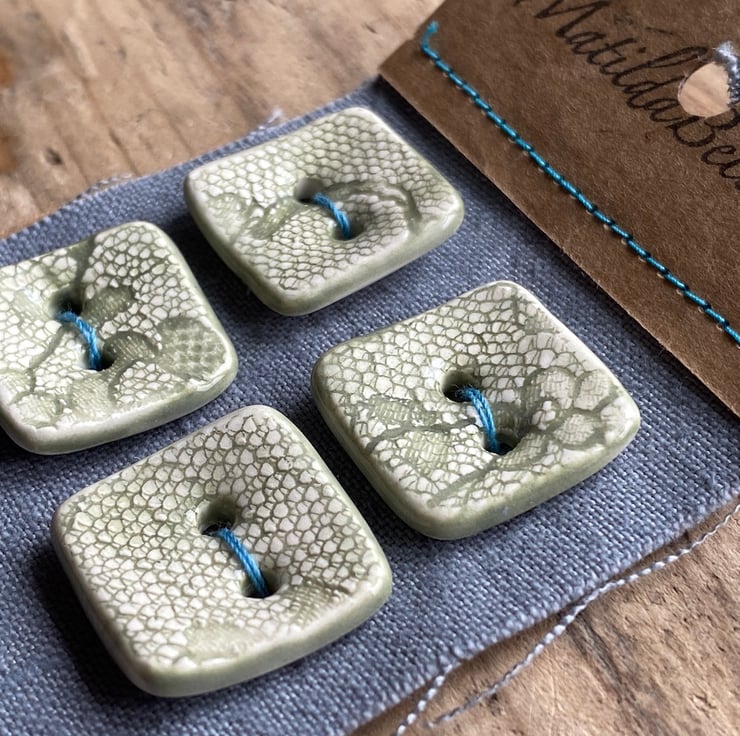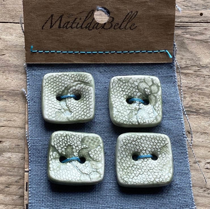 This Beautiful set of 4 Square buttons have been handmade from Earthenware Clay. Each little button is imprinted with Vintage Lace that shines through the soft Green glaze beautifully.