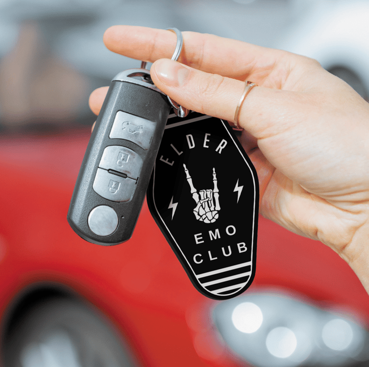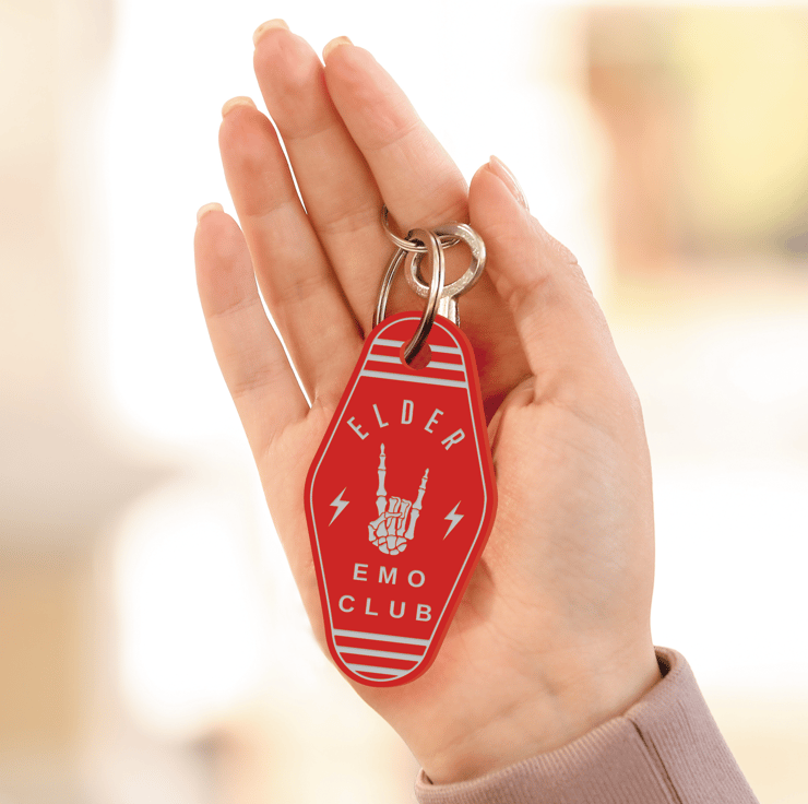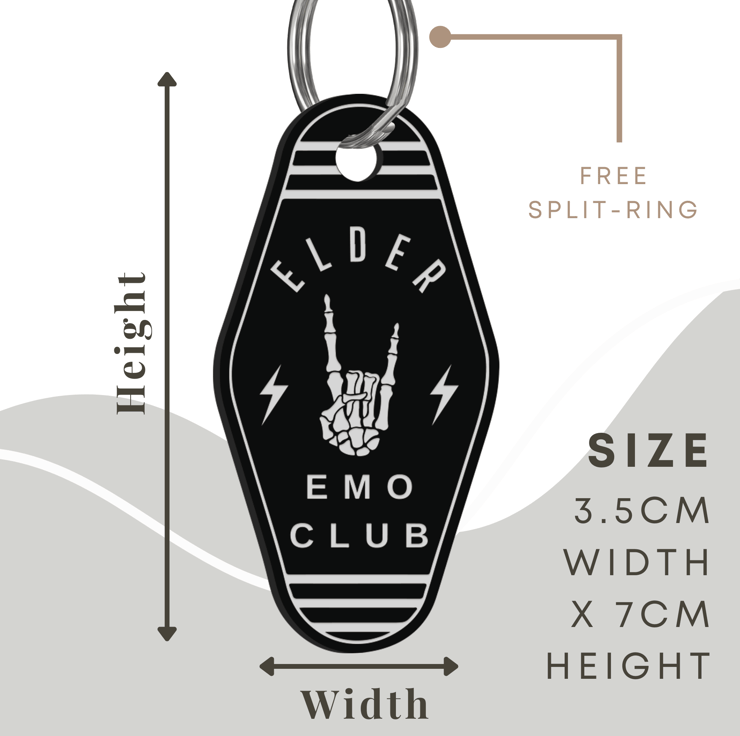 Celebrate your emo spirit with our 'Elder Emo Club' Motel-Style Acrylic Keyring. This quirky keychain is the perfect accessory for those who proudly embrace their emo roots and love a good laugh.
