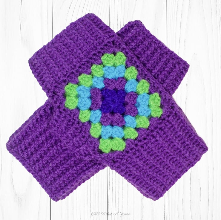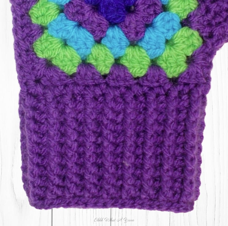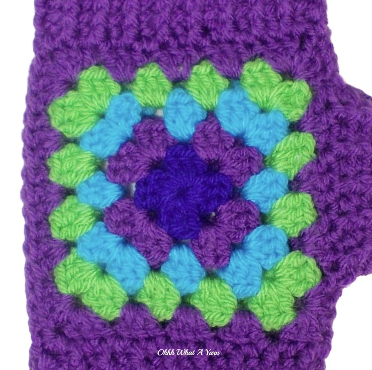 They have a granny square on both the back and palm and I have edged the cuffs and finger edges with a crochet rib. The thumb opening also has a crochet rib edging.