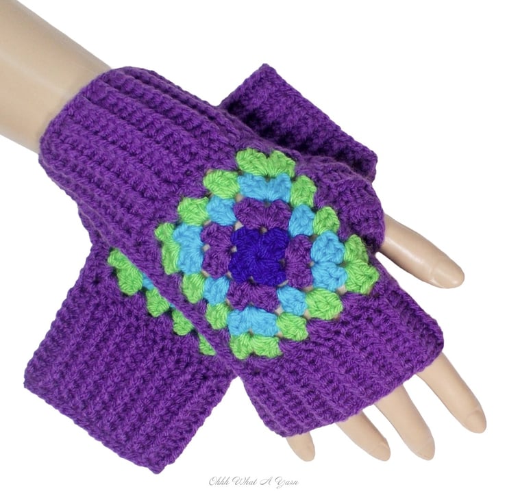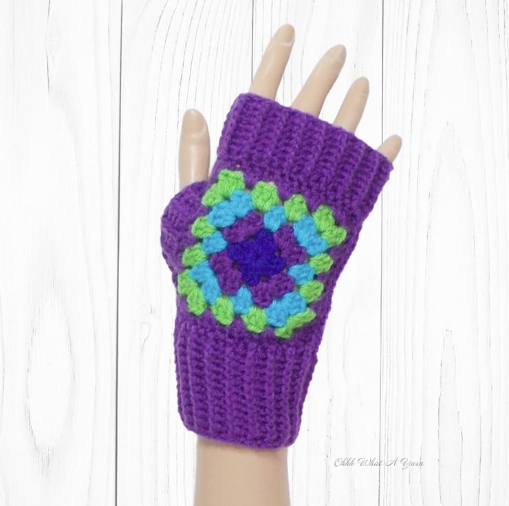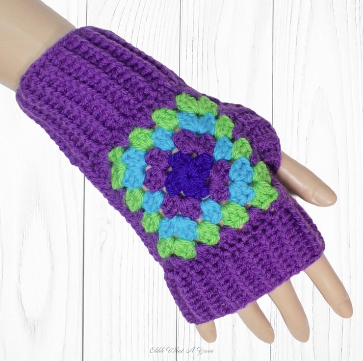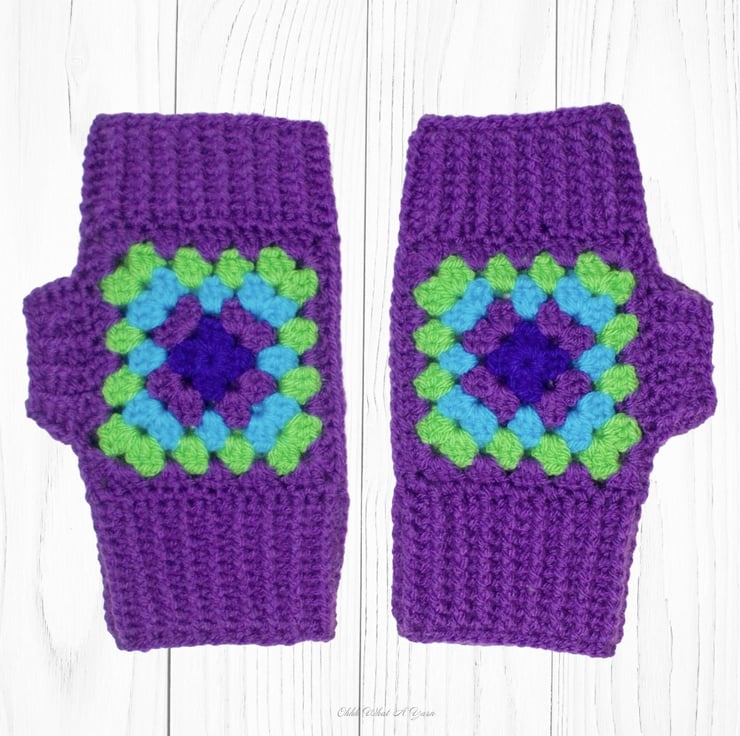 These gorgeous granny square fingerless gloves have been crocheted using 100% acrylic yarns in beautiful peacock inspired colours to my own pattern.