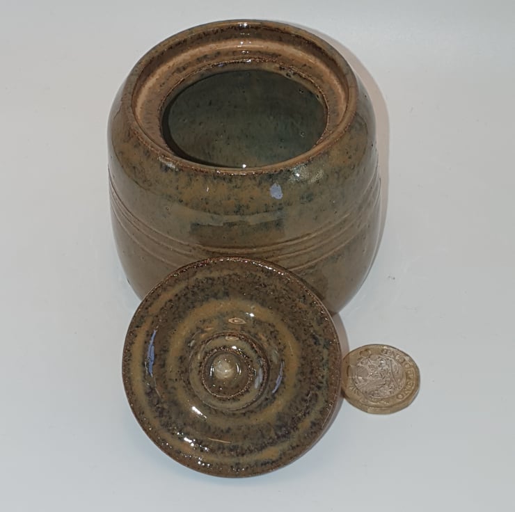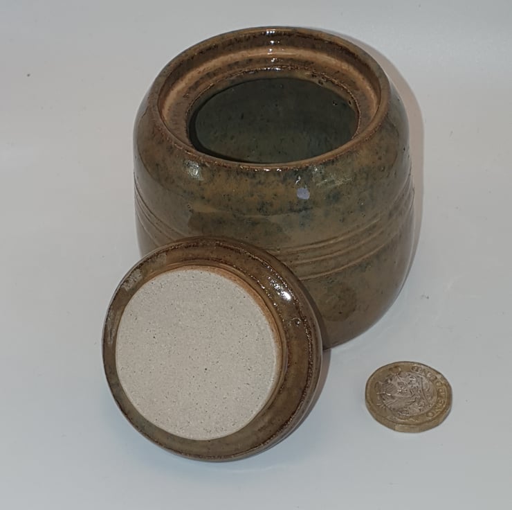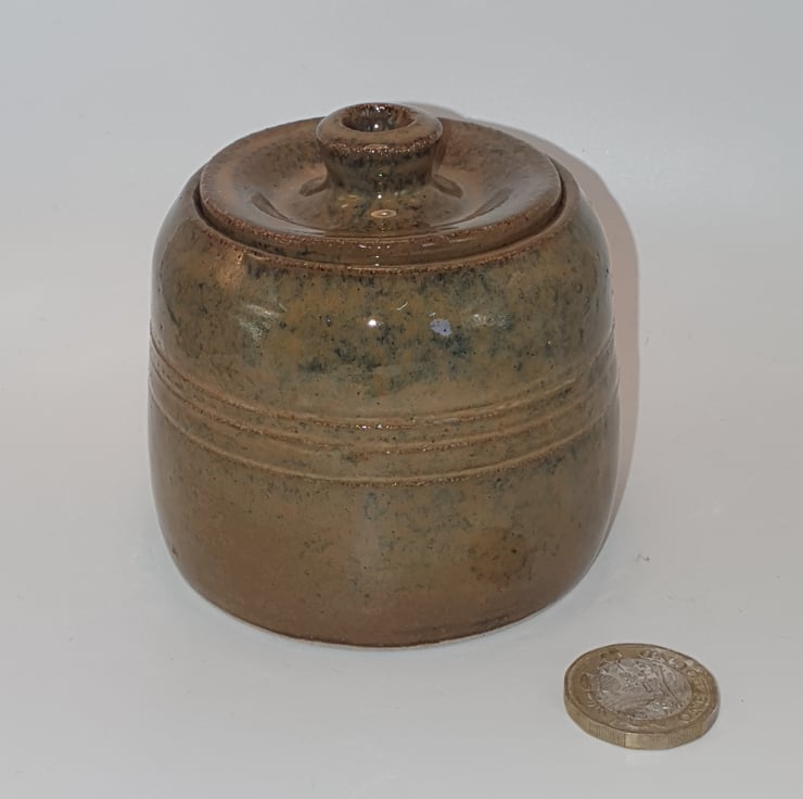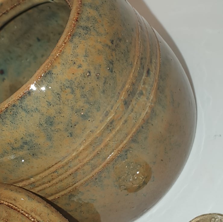 Wheel thrown. Stoneware. Glazed in a sandy brown. Decorative lines carved around the body.