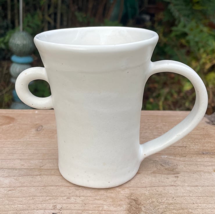 This works as a rest on the supporting hand. Or doubles as a pinch hold. It can help with tremors or when you need 2 handles to support the cup whilst drinking.