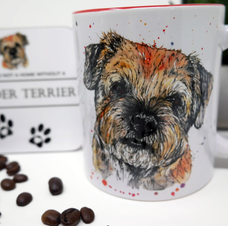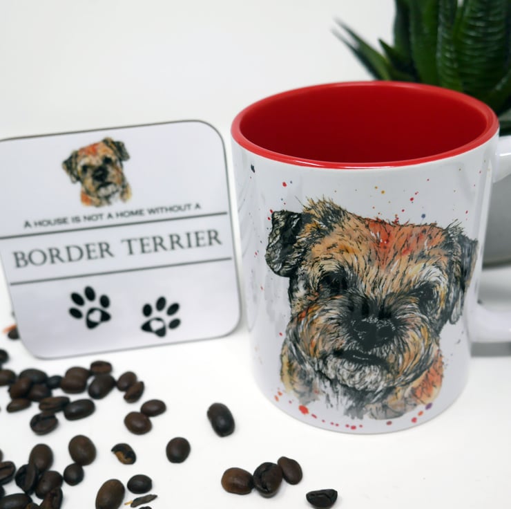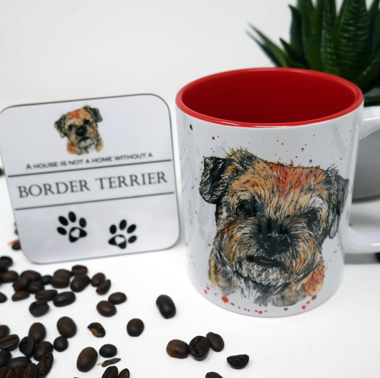 Border Terrier 11oz ceramic mug and coaster featuring my watercolour & ink painting of an gorgeous Alfie the Border Terrier. (Red inner)