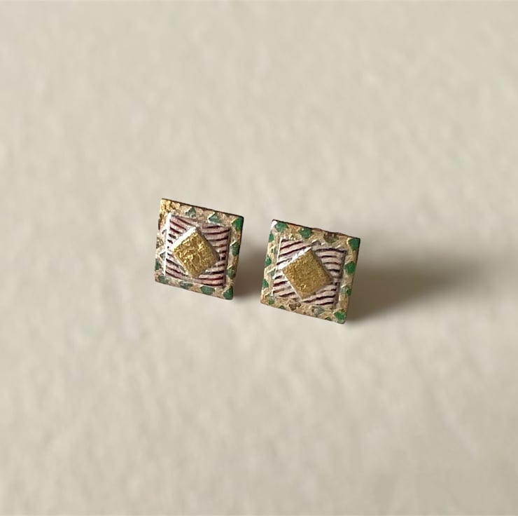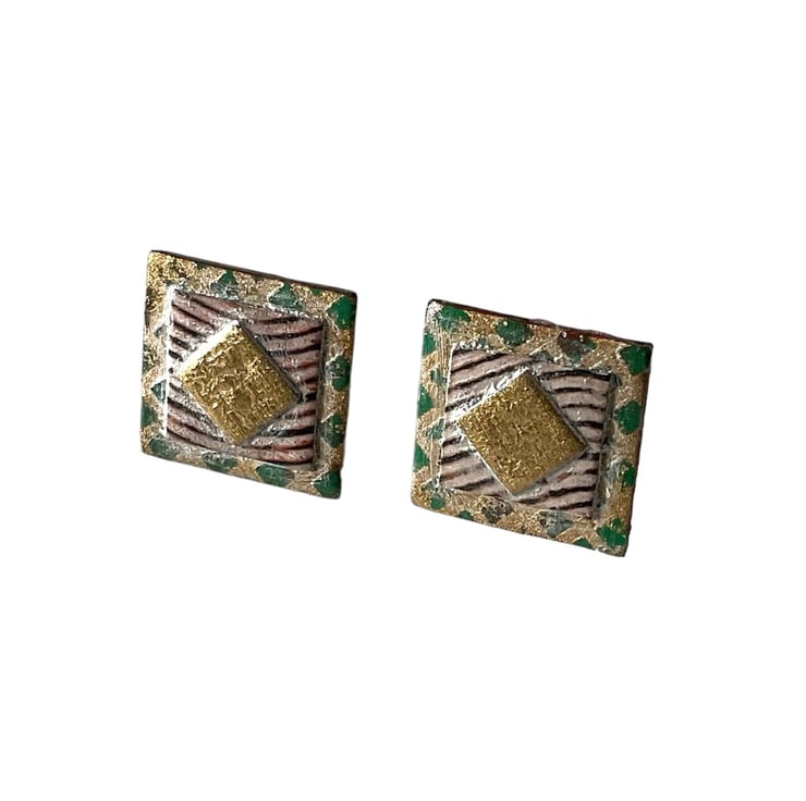 Pretty green, cream, red and gold ethical ear studs with a geometric gold embossed design. A unique hand painted paper item using acrylic paints, gesso and gilding foils on paper. Up to six layers of laminated paper creates a strong base on to which the top design is glued, each pair is ‘one of a kind’ with a gently distressed appearance giving an aged texture and look.