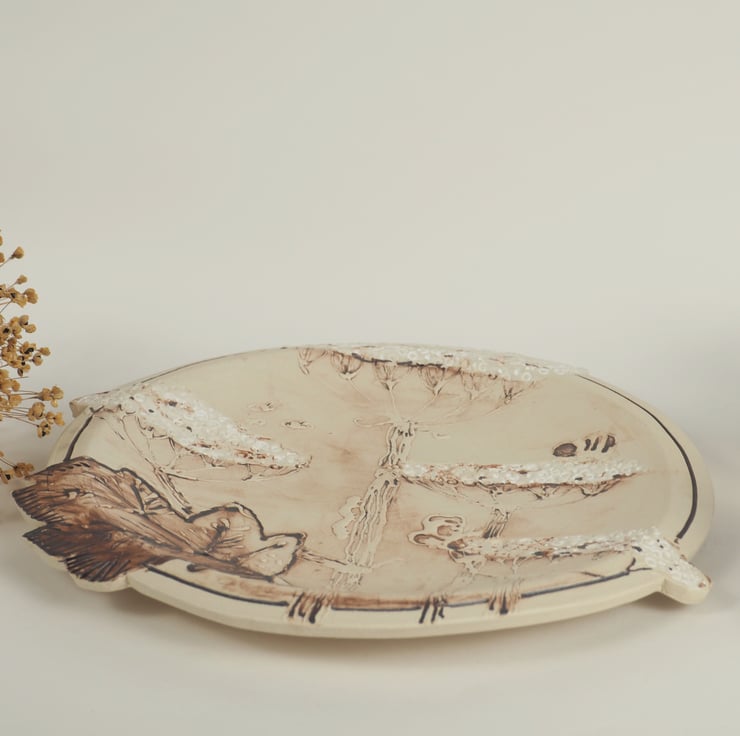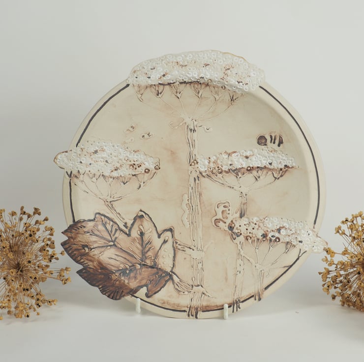 This decorative bowl has been press moulded and then trimmed on the wheel to create a foot ring. The cow parsley decoration extends over the circular edge to give an irregular shape, and the design has been created with a mixture of slip trailing and impressions and scratching. A small butterfly and bee rest on the flowers and a caterpillar is crawling up the central stem. Colouring is from iron oxide and white underglaze, against the natural colour of the fired stoneware clay.