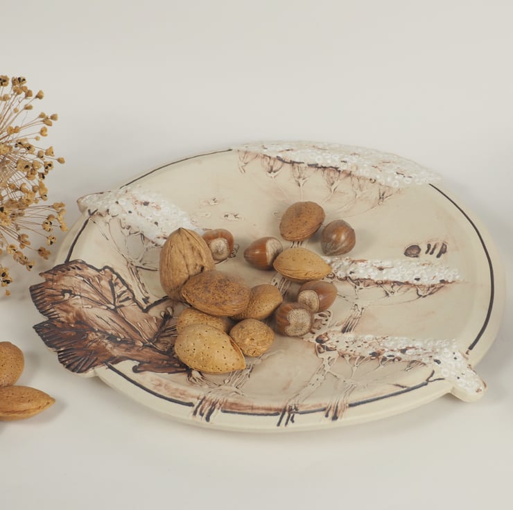 This is a decorative bowl and not recommended for food use due to the deeply textured surface. Could be hung on the wall with a plate hanger (not supplied) or held vertically on a stand as shown in the images. Approximately 25cm at widest point.