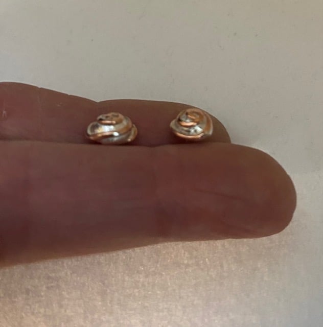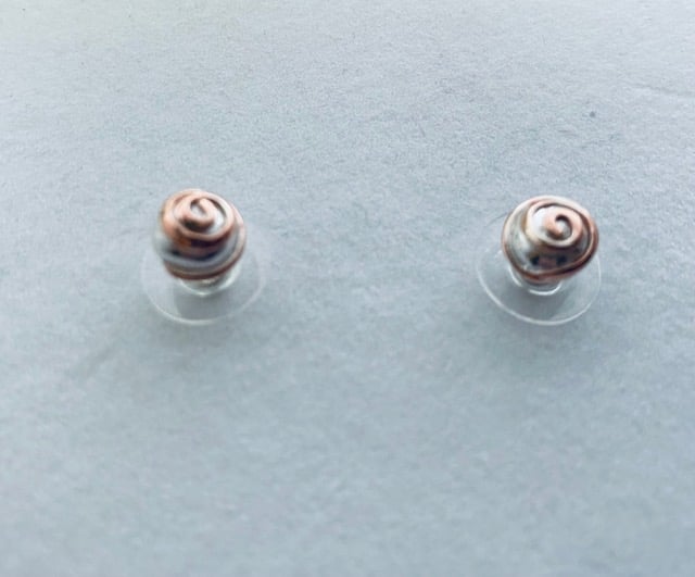 Sterling Silver Studs. Recycled Silver cast into a round pebble earrings with copper wire spiral.