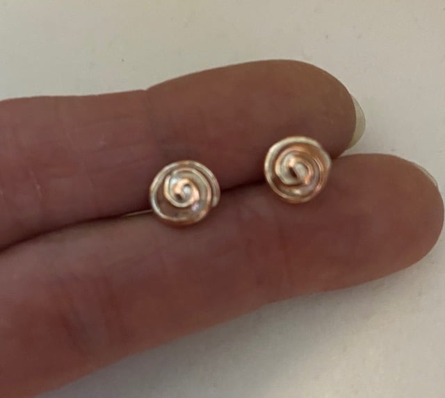 The studs have been created from recycled sterling silver heated to melting point creating little silver nuggets. Once cooled I have added some hand coiled copper wires for decoration. Soldered to regular .925 sterling silver ear posts with butterfly backs and burnished to a shine.