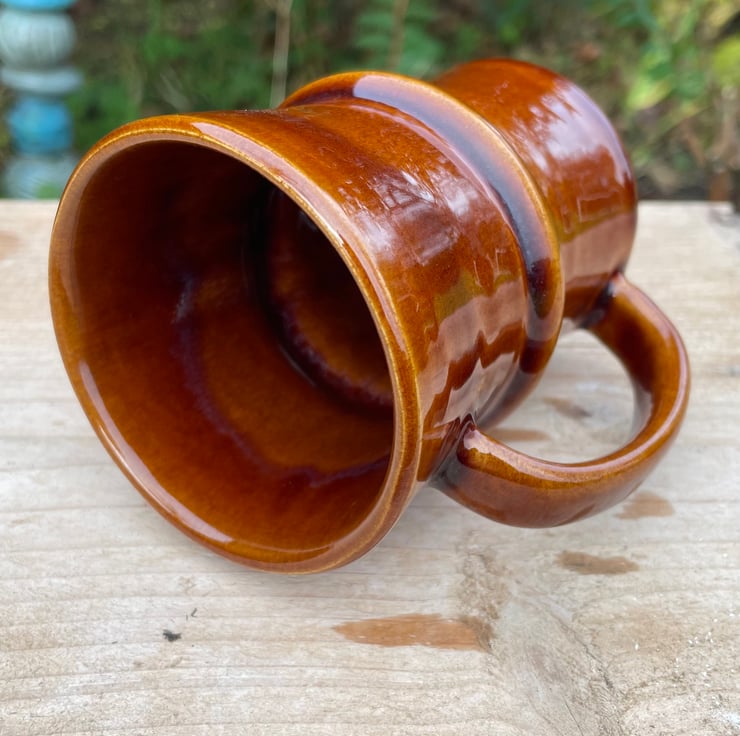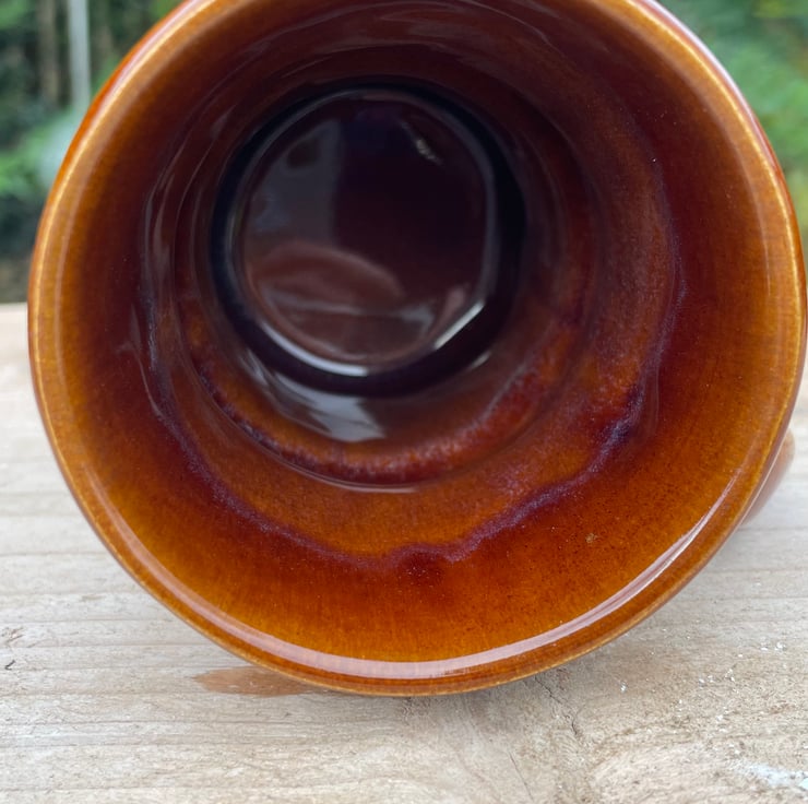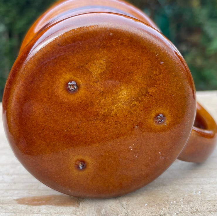 It is made via a mould made from my protected design. It has then been slipcast, finished and fettled by hand and then bisque fired. I then personally glaze each piece myself. They are fired on a 3 pin stilt and you will see the discreet pin marks on the base as featured in the last photograph.