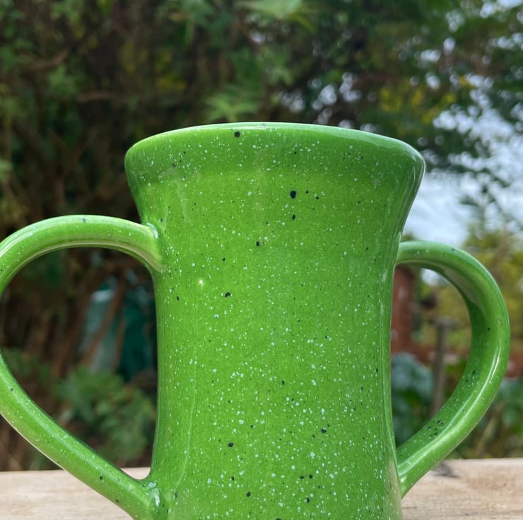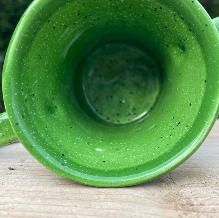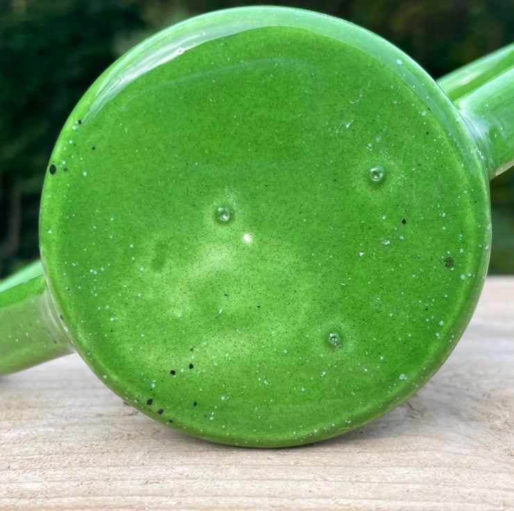It is made via a mould made from my protected design. It has then been slipcast, finished and fettled by hand and then bisque fired. I then personally glaze each piece myself. They are fired on a 3 pin stilt and you will see the discreet pin marks on the base as featured in the last photograph.