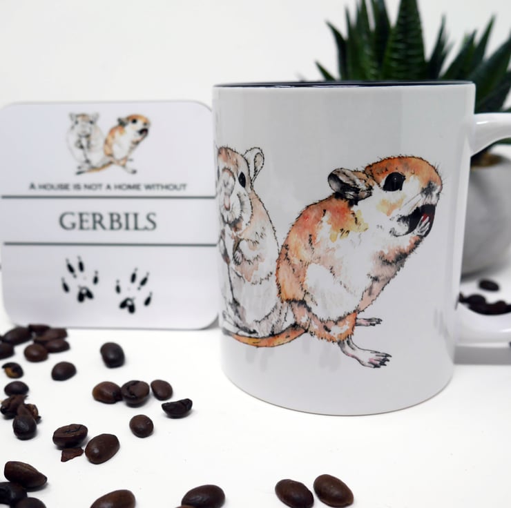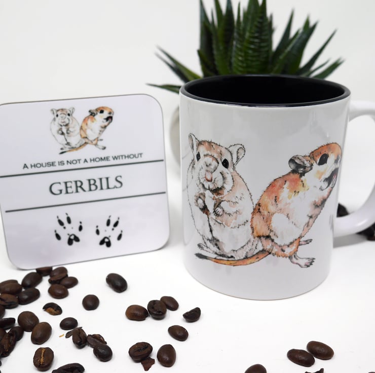 Gerbil 11oz ceramic mug and coaster featuring my watercolour and ink painting of the adorable gerbils Koa & Roo.