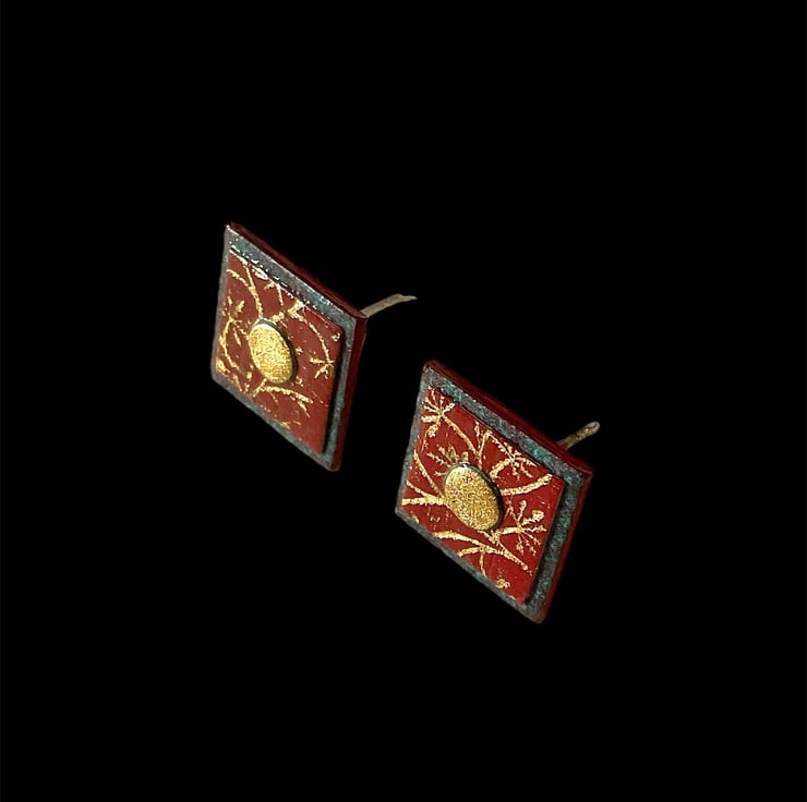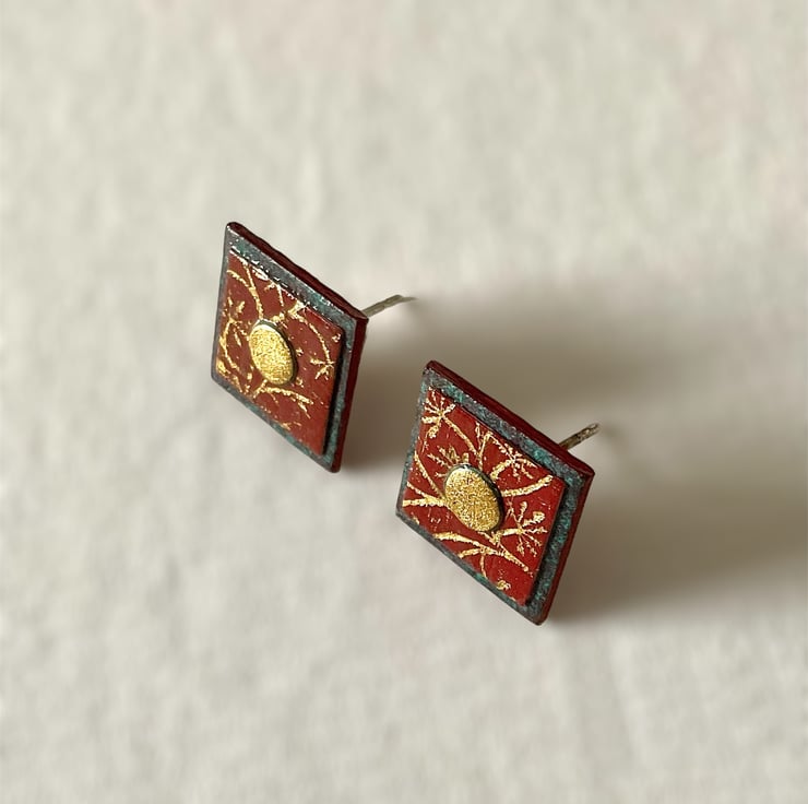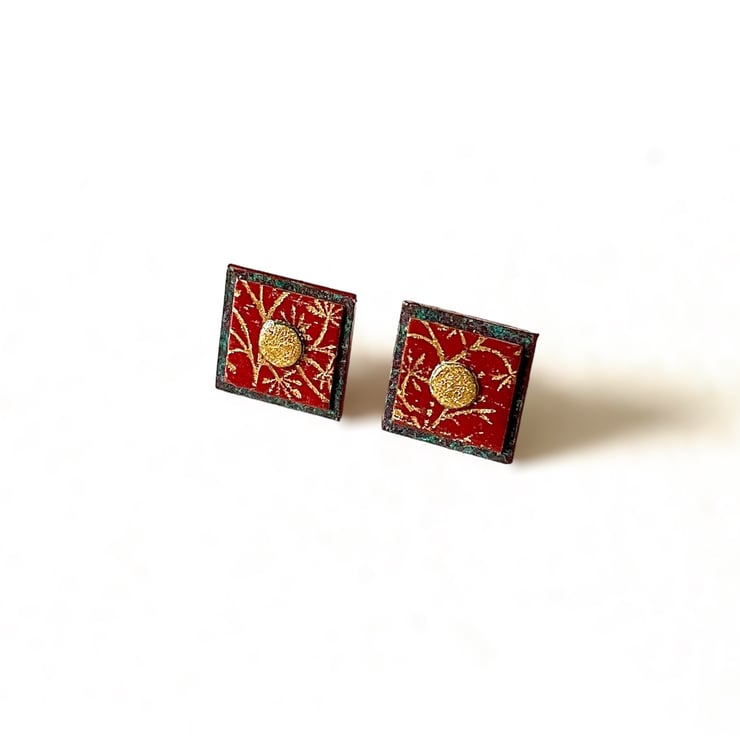 Dainty rich square terracotta ear studs with embossed floral filigree design and gilded central dot made from hand painted gilded paper. A lightweight colourful pair of ear studs ideal for a special occasion or Christmas party.