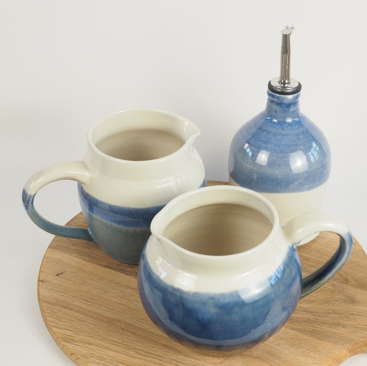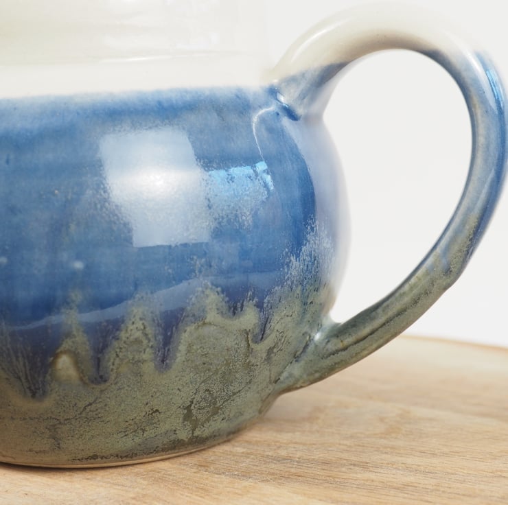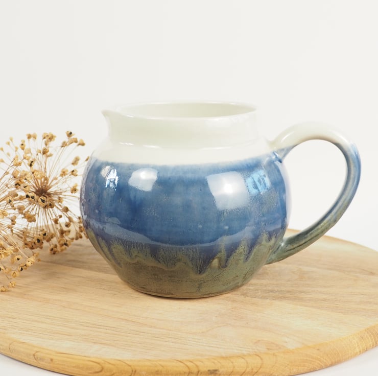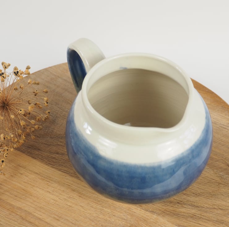 A round jug with blue glazed exterior and glossy transparent glaze inside. The two glazes overlap to create a decorative shiny blue pattern on the jug.