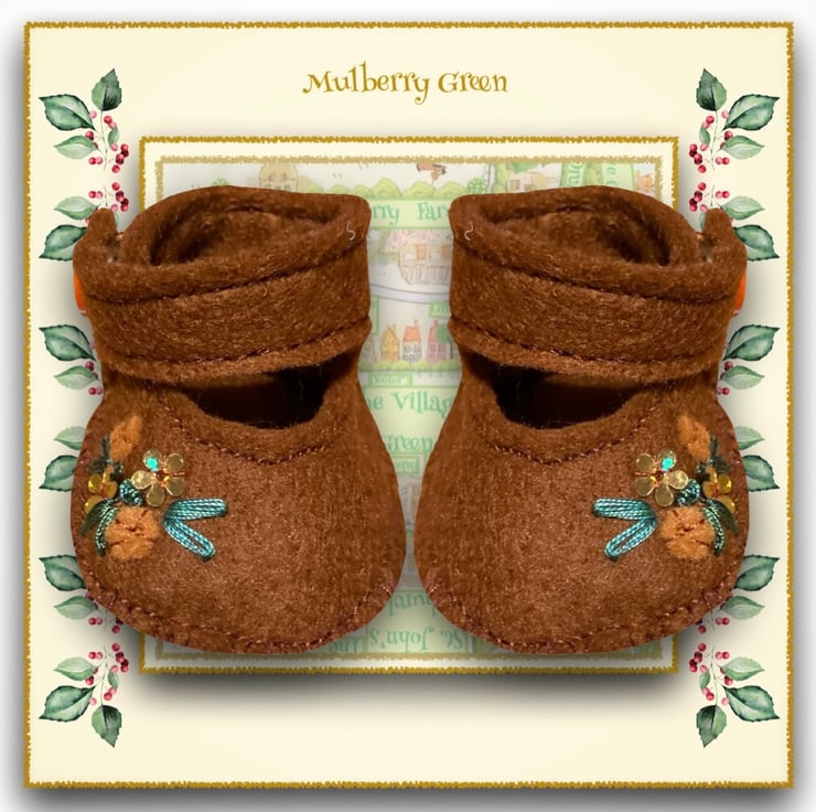 A cute little pair of chestnut brown embroidered shoes, to fit the Mulberry Green characters. The shoes look lovely with the little dresses in my shop.