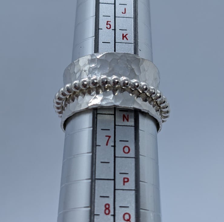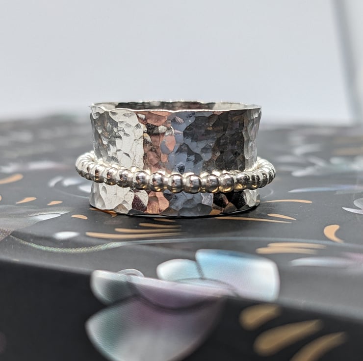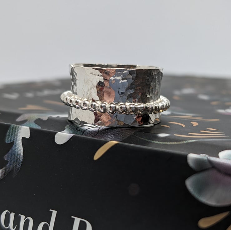 This simple, sterling silver spinner ring has been has completely handmade. The deep band has been hammered to create a reflective finish and the ring has a single spinning ring made from beaded wire. The ring measures a size M.
