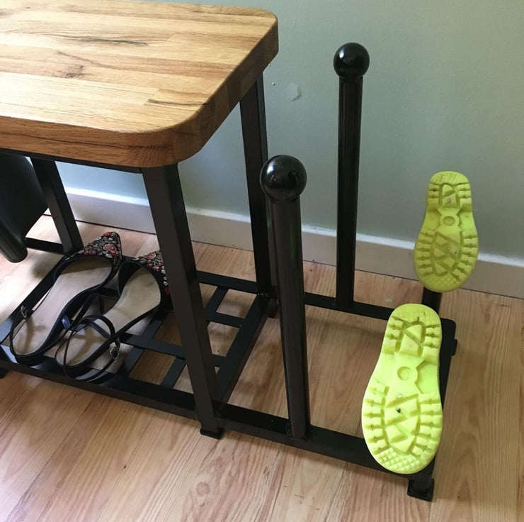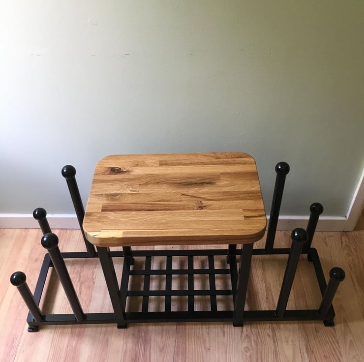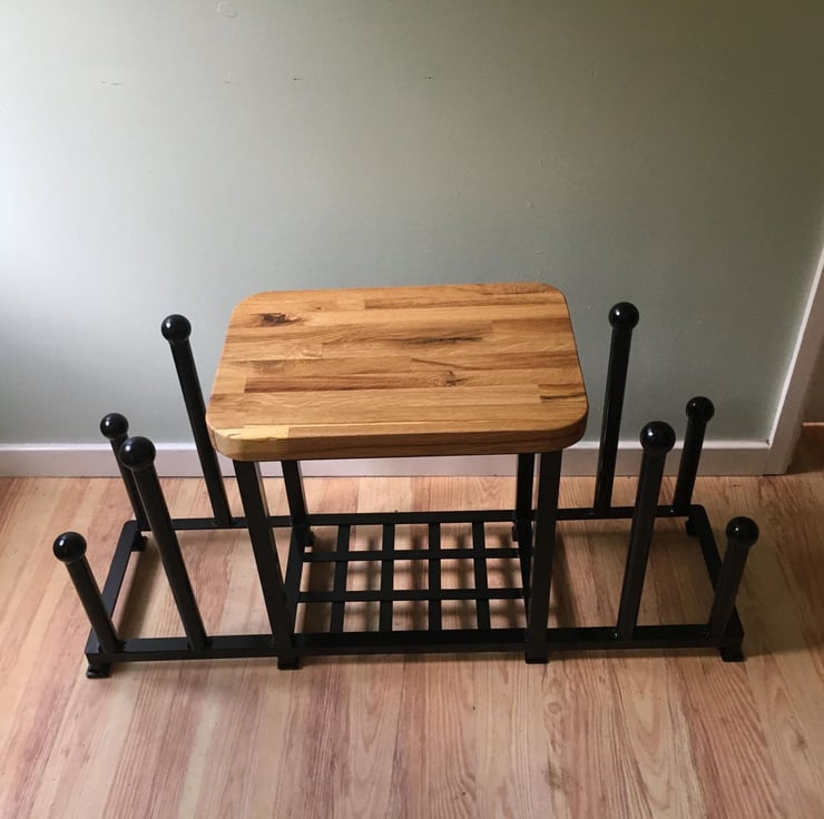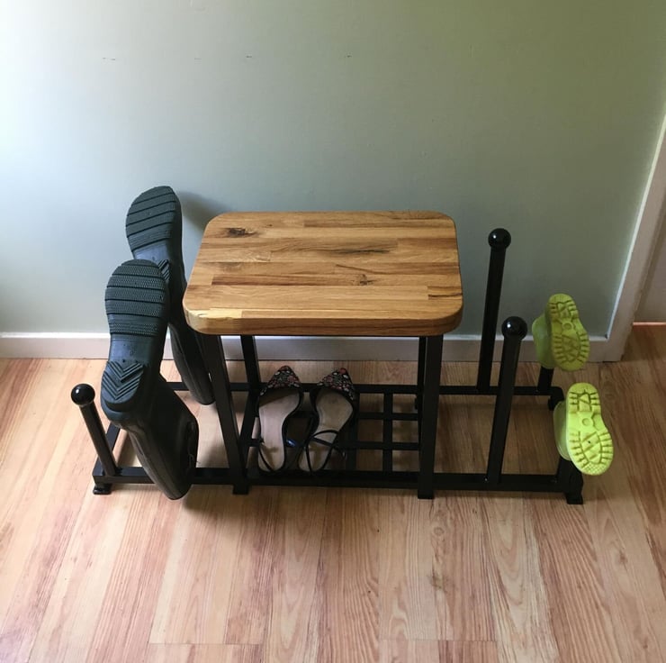 This bespoke piece has been designed and hand crafted by John our precision welding engineer. It's always easier after a walk in the woods to take a seat to rest and remove your boots or wellington boots. And that goes for the whole family!!! There is space for 2 large sets of boots and 2 small sets of boots and the frame has been sprayed with a smooth black enamel paint. The Wellington boot store has the farmhouse and industrial look and the seat top has been finished in a solid butchers block oak. It's Ideal for helping children to steady themselves, take a seat and take off their muddy boots. We like to think of our furniture as versatile and this is a great addition for the hallway, entryway, backdoor or porch