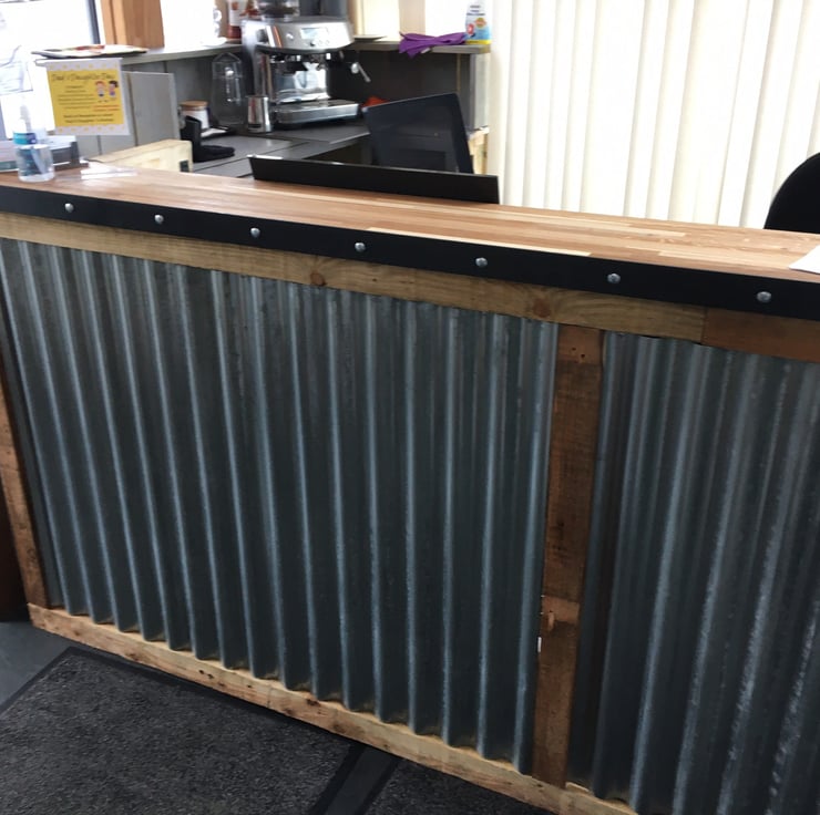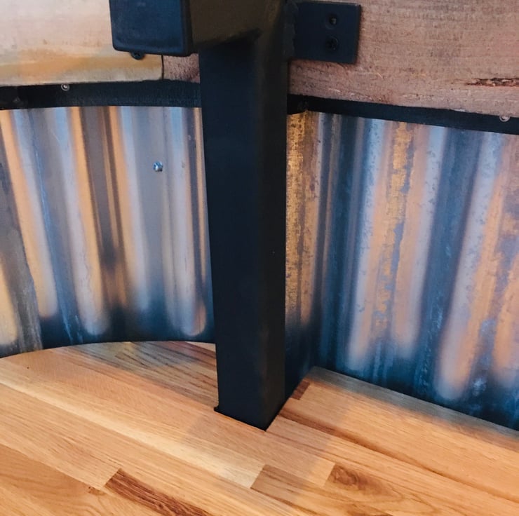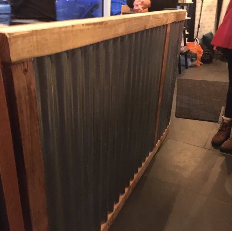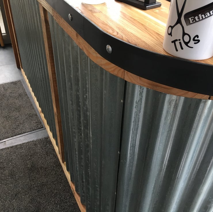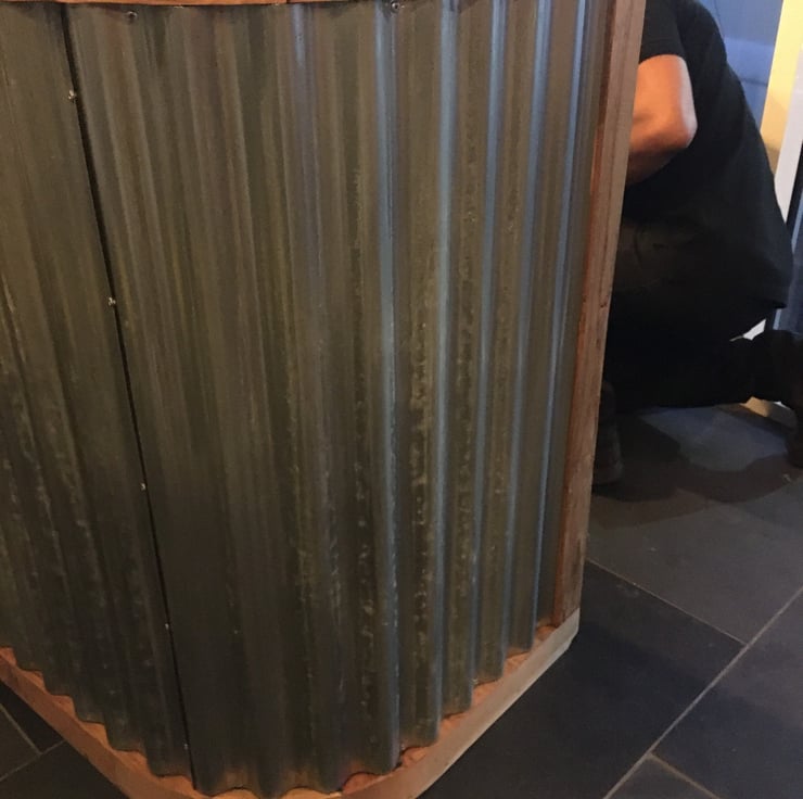 John will craft corrugated steel, into straight panels with a curved return, this return will have a hinged doorway and the door way will be between the kitchen units and the bar with dimensions of the door width to be confirmed (approx 600mm)