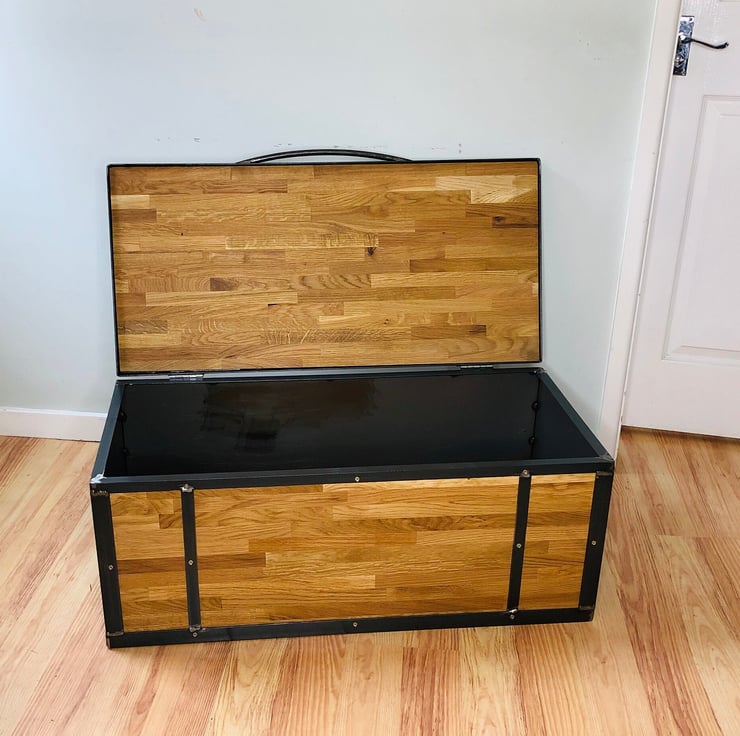 The brushed steel effect is very striking and furnishes the sides and back of the trunk, whilst the solid oak top and front give a high quality edge to this piece.