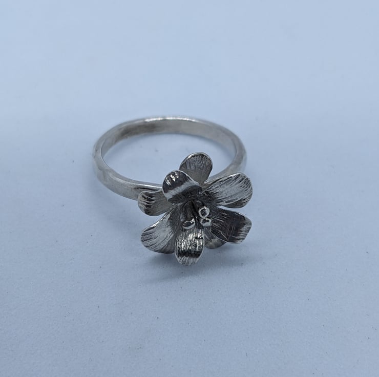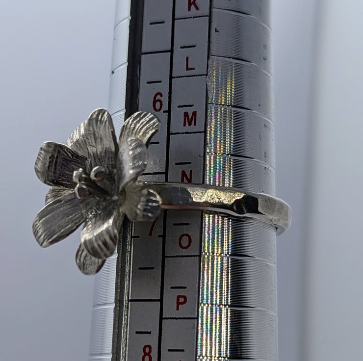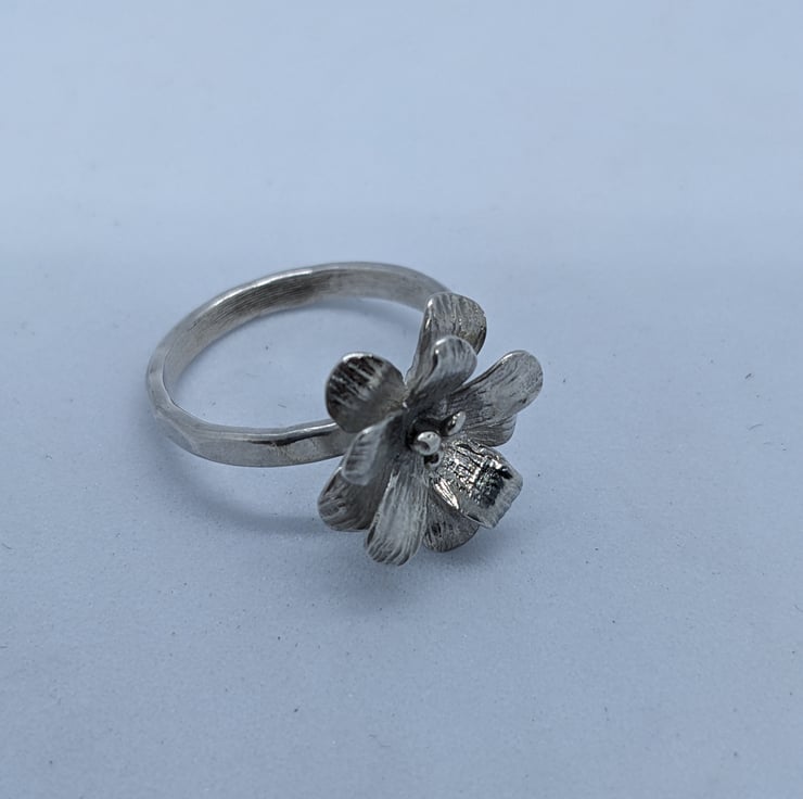 This delicate sterling silver ring has been completely handmade. The flower has a double layer of shaped and hammer textured petals and sterling silver stamens. The ring shank is also hammered to create a reflective surface. It would make a thoughtful gift for anyone who loves nature or flowers. It is a size N/O.