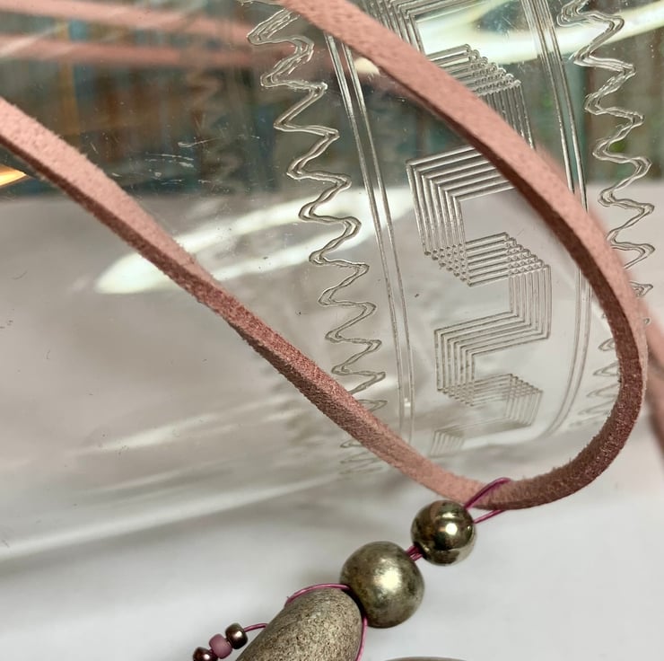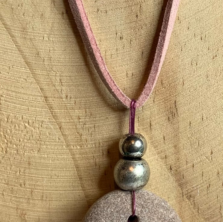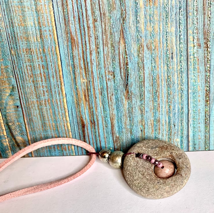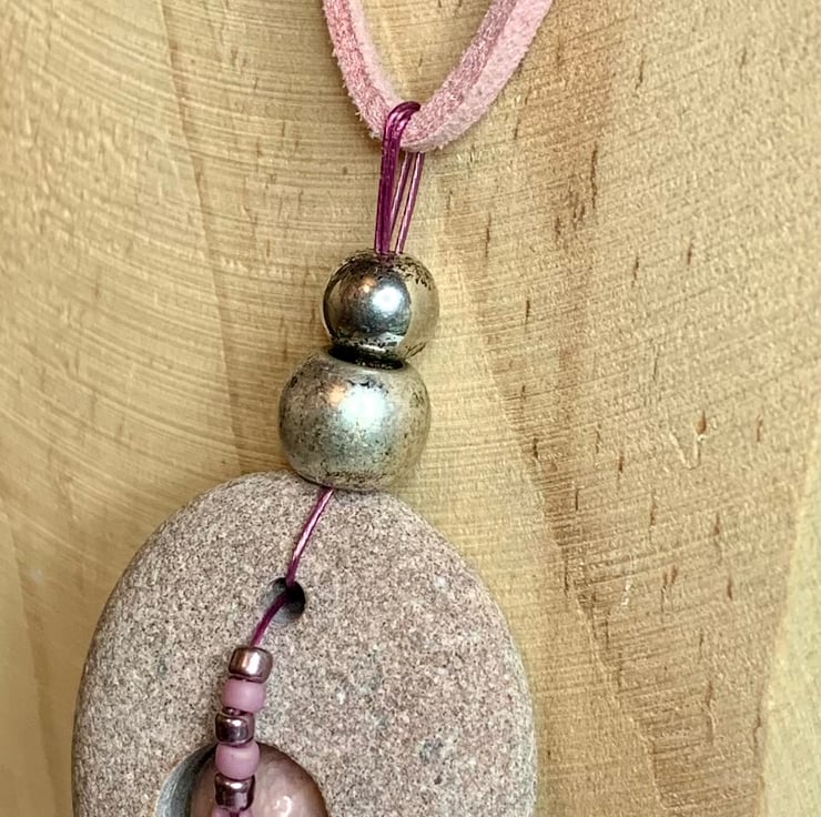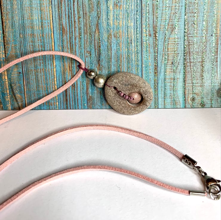 In this pebble I saw hints of pink which led me to look for a pink centrepiece and cord, once I had these I drilled a hole and went about fitting the beads. I really love the delicate colour!