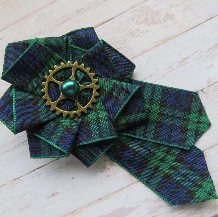 Created with a small circle of dark green felt with a small brooch pin attached and a handmade and sewn ruffle of Black Watch tartan ribbon with wide ribbon shaped trails and finished with a large bronze Steampunk cog and dark green pearl stud.