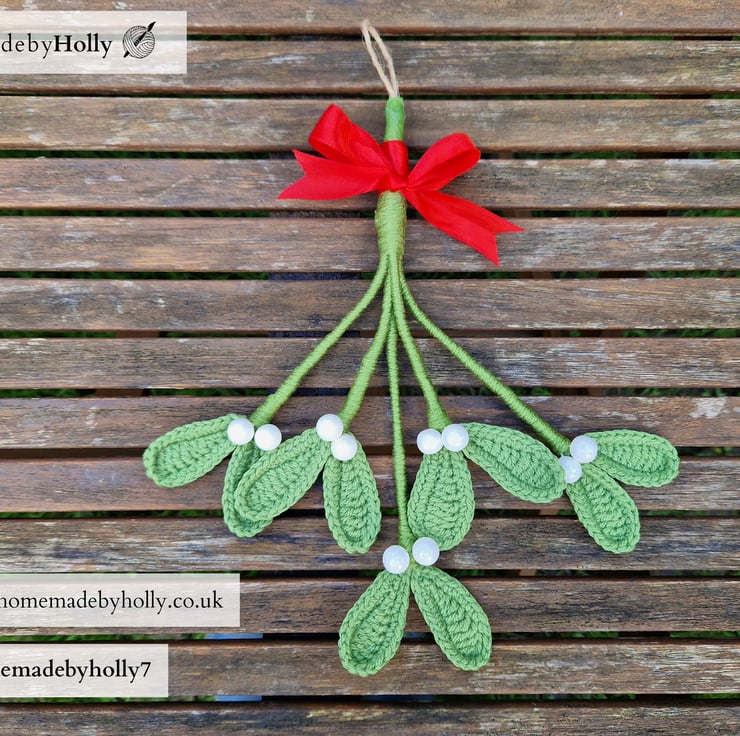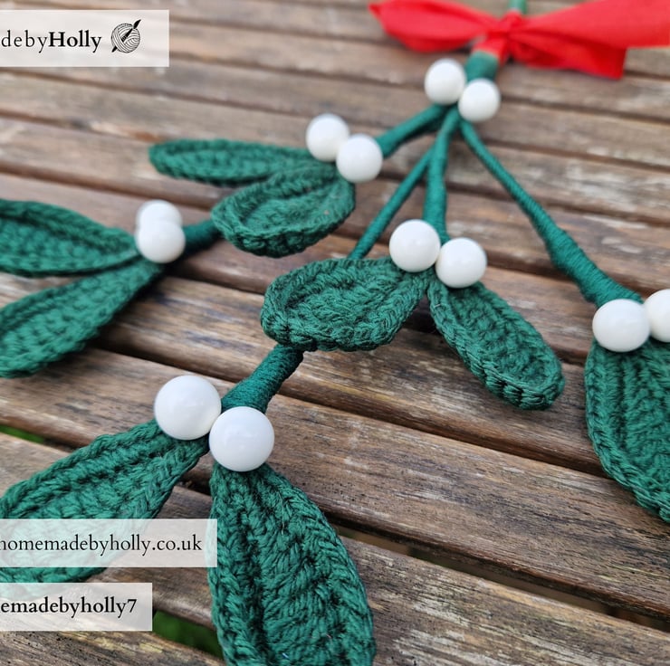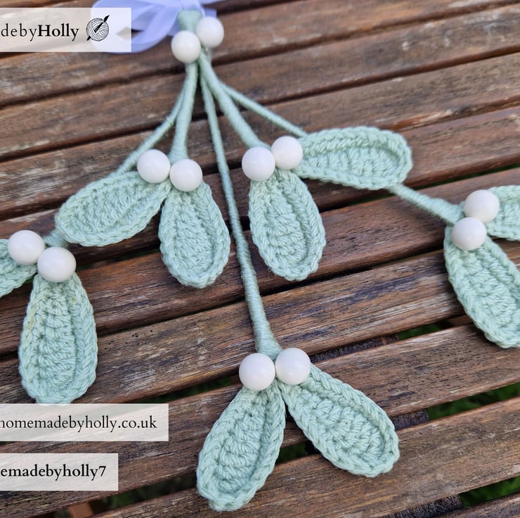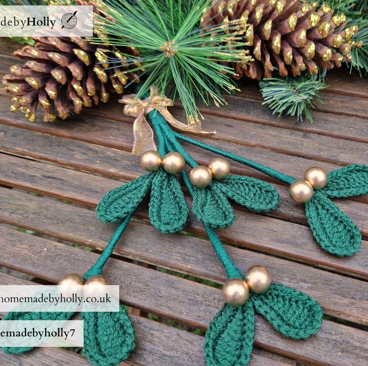 Crocheted mistletoe. Each leaf has a thin wire crocheted inside so they can be adjusted and freshened up.
