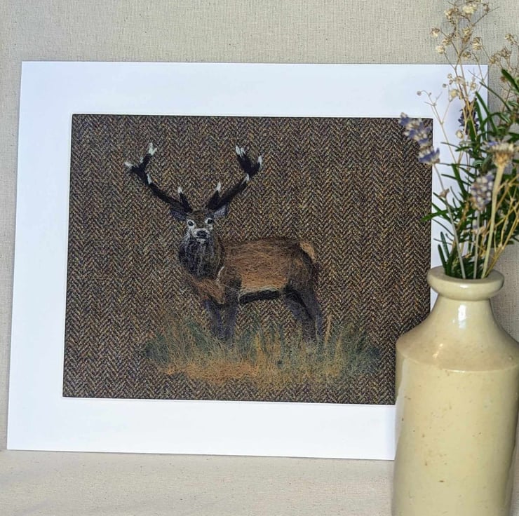 This fiber art picture of a Red Deer Stag on Exmoor has been created using locally sourced wool from Exmoor farms using the needle felting technique. The needle felting process binds the fibres together and the different coloured wool is blended together to create the different shades. I have used an upholstery tweed effect fabric as the background.