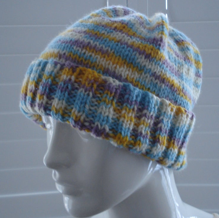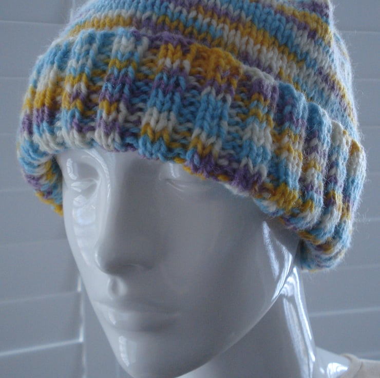 This is a hand knitted hat in a lovely thick Aran yarn. It is a generous size and would fit an adult head. There are also a matching pair of fingerless gloves in the shop.
