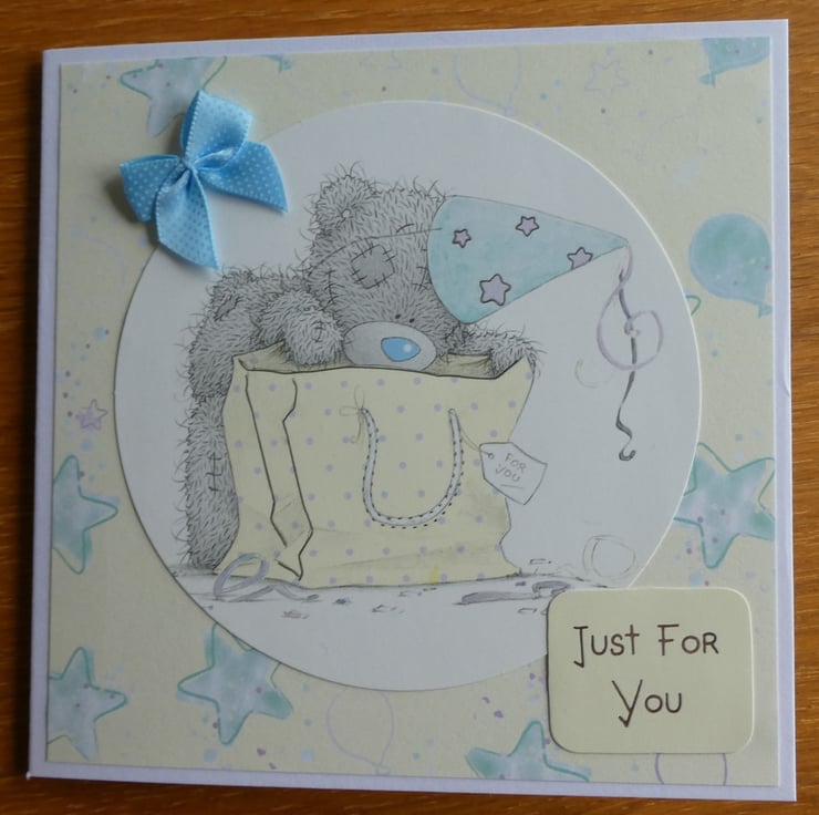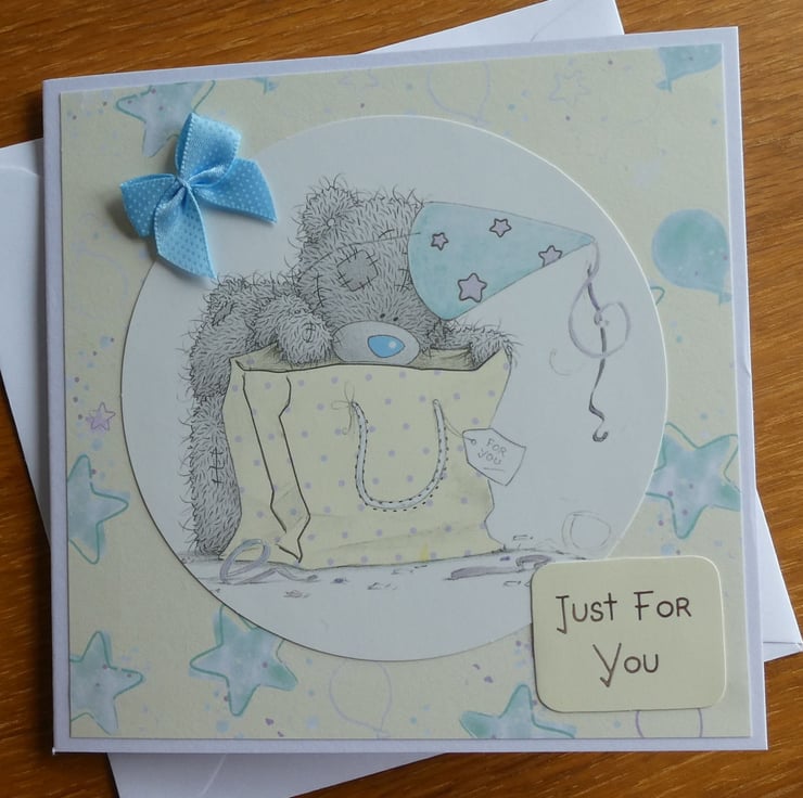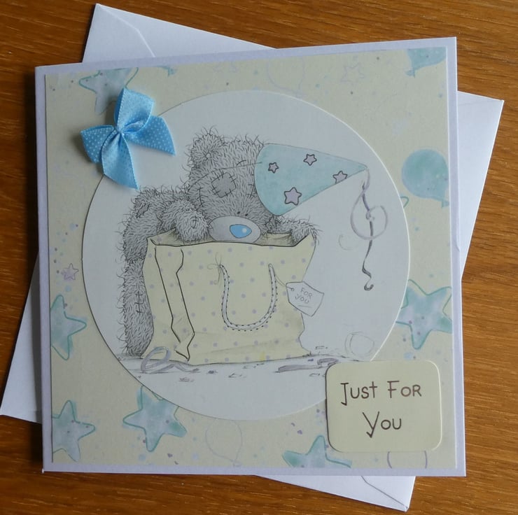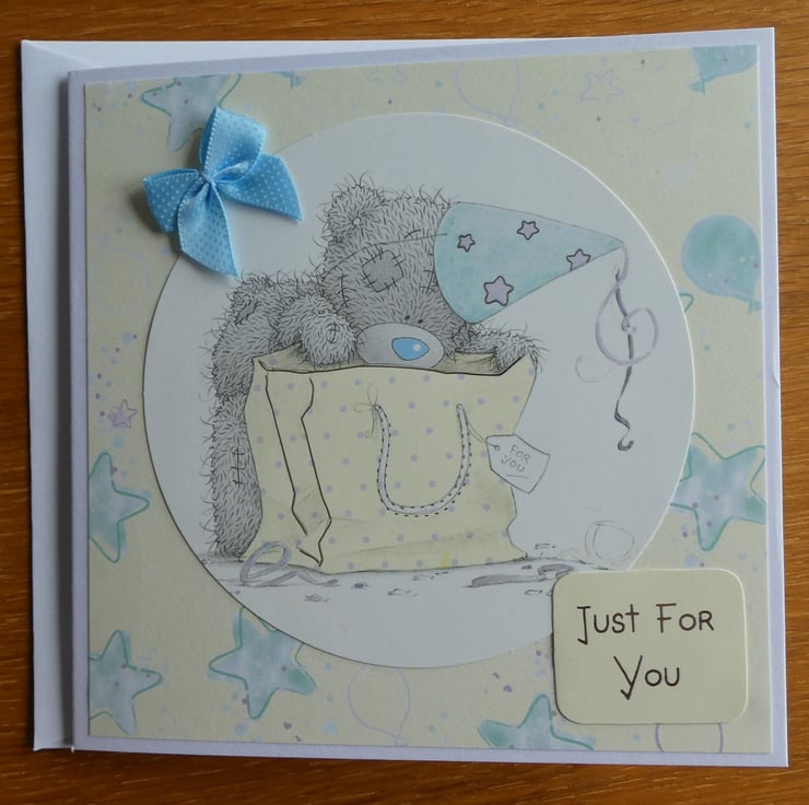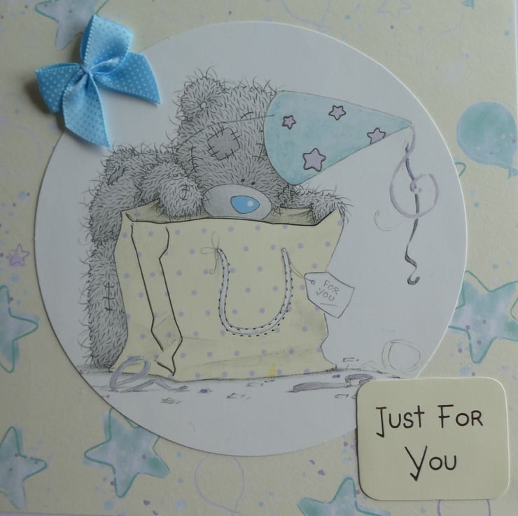With the message Just For You this sweet Tatty Teddy Birthday card shows a teddy wearing a party hat and peeping into a gift bag.