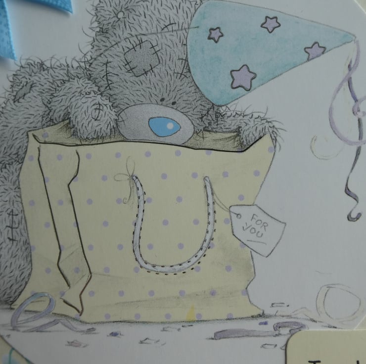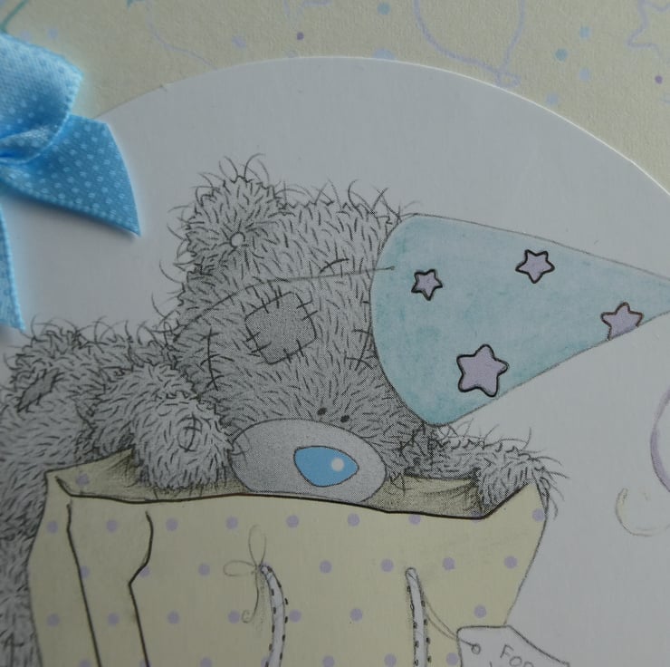 The card has a circular printed image showing Tatty Teddy bear wearing a pale blue party hat bedecked with stars and streamers peeking into a lemon and lilac polka dot gift bag. The image has been mounted onto a lemon background paper patterned with balloons and stars. The design has then been finished with a blue and white polka dot bow.
