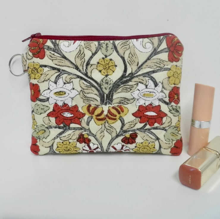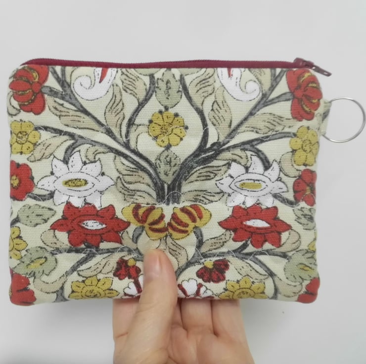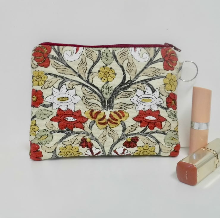 Flat style with a dark red zip across the top and a keyring loop inserted into one of the side seams.