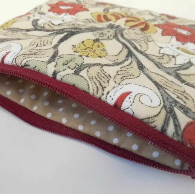 I have made this purse using a medium weight cotton fabric with an art nouveau style print of winding stems and red flowers on a dark cream background. The inside is lined with a spotted quilting cotton.